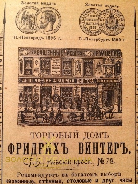 30 июня 1828. Владикавказ." Большие старинные консольные кабинетные часы с четвертным вестминстерским боем, выполненные в классическом английском стиле. Часы изготовлены в 1880 годах торговым домом Фридриха Винтера в Санкт-Петербурге. Крупный деревянный корпус, украшенный точеным декором, покрыт черным сатиновым лаком. На фасадную часть вынесен регулятор точности хода и рычаг отключения боя. Дверца с фацетным стеклом. Механизм четвертной. Каждые 15 минут молоточки, управляемые вращающимся барабаном, мелодично отбивают количество четвертей. На посеребренном циферблате под цифрой 12 - клеймо F. Winter. История компании Фридриха Винтера неразрывно связана с Петербургом. Ведь именно Винтер был создателем наиболее знаковых пет