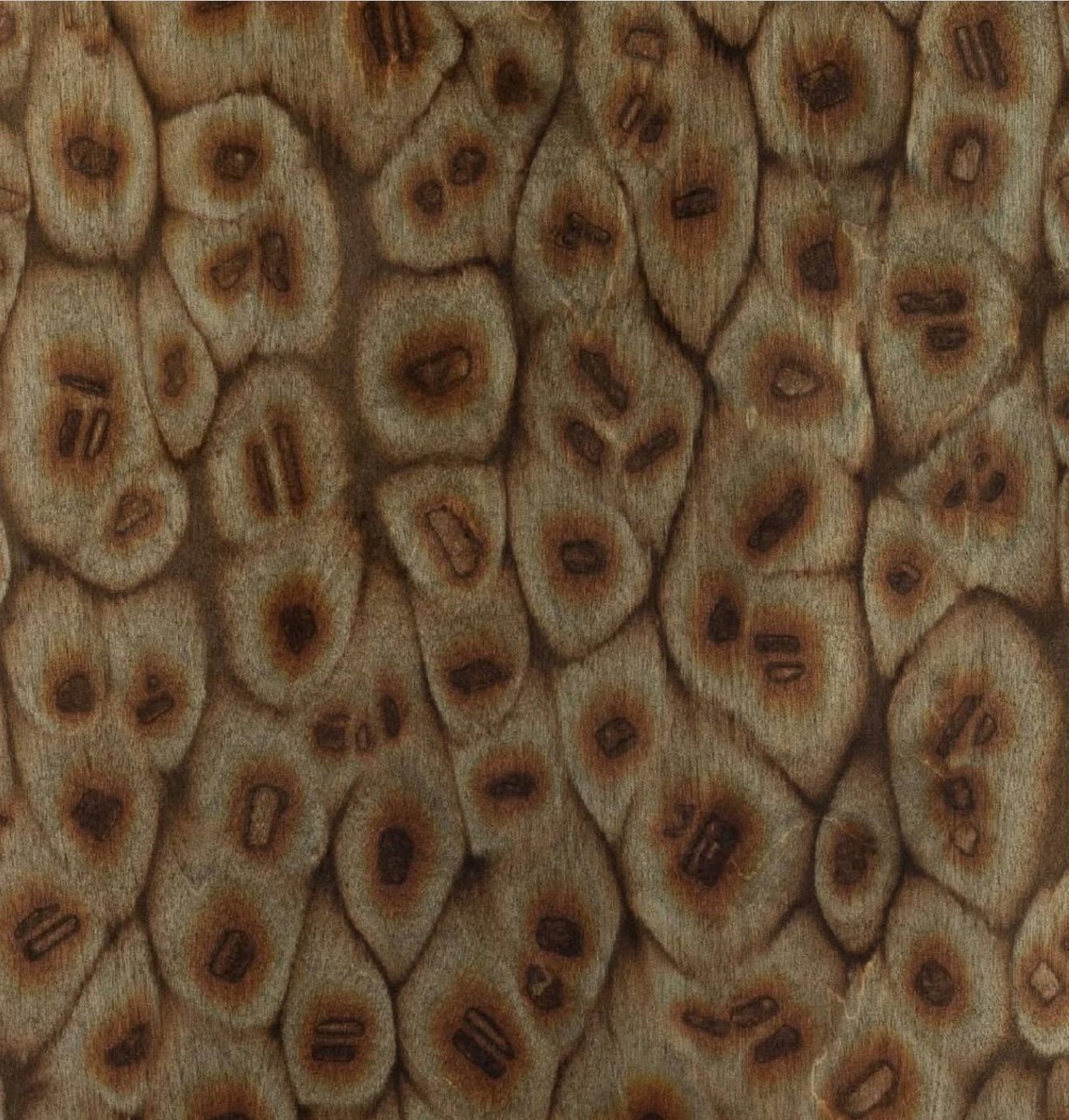 OSIS – это метод обработки древесины неорганическими солями для получения уникального рисунка. На поверхность древесины раскладывают кристаллы, соль вытягивает влагу и растворимые вещества из материала (танины и фенольные соединения). Под кристаллом они концентрируются и окисляются, образуя тёмную точку. А вокруг формируются характерные ореолы. Это не отпечаток соли и не окрашивание. Рисунок – результат локальной химической реакции внутри древесины, поэтому он всегда неповторим 🐆