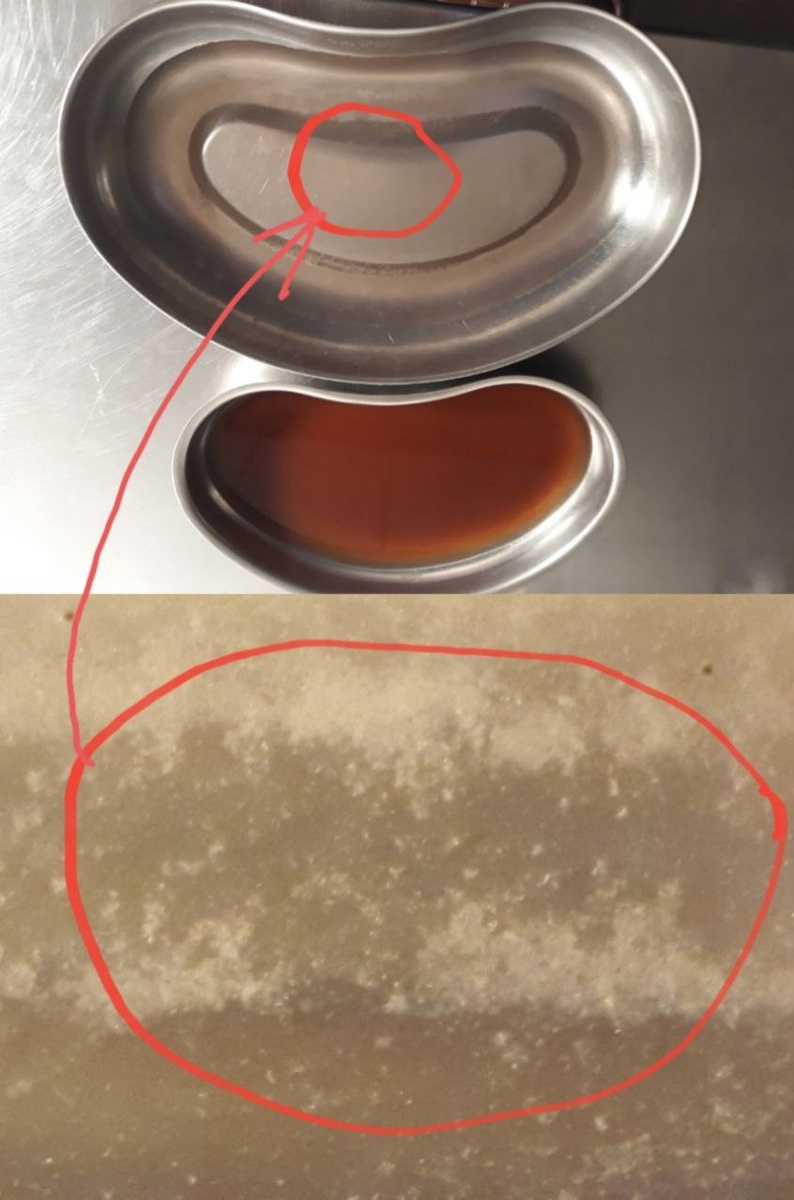 Первичная моча взята через катетер с большим количеством крови. В большой кювете моча после промывания мочевого пузыря. Ураты представлены обильно. Терапия длительная, на перспетиву прогноз осторожный.