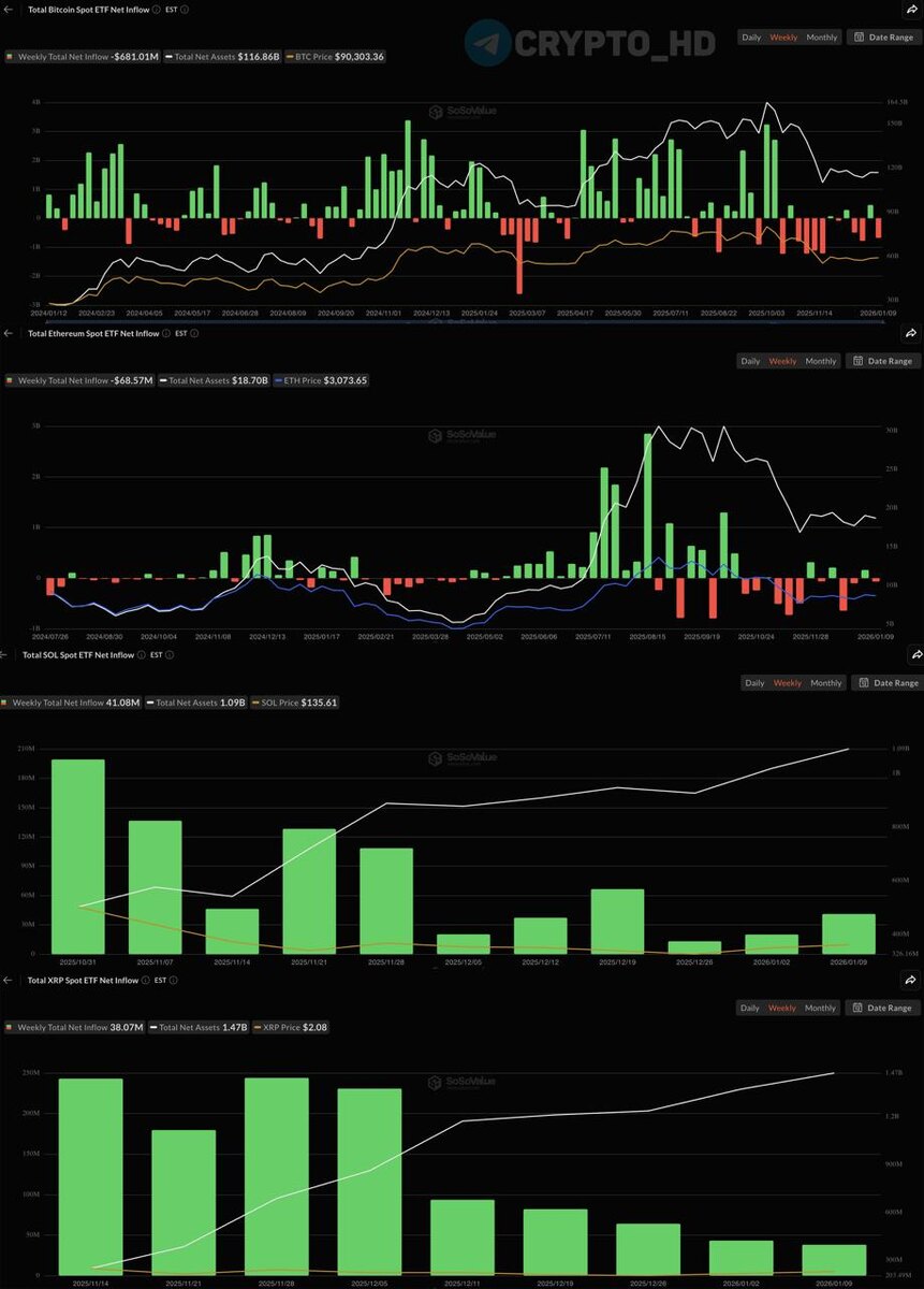 βΉ Bitcoin ETF (#BTC) = -$681,010,000. βΉ Ethereum ETF (#ETH) = -$68,570,000. βΉ Solana ETF (#SOL) = +$41,080,000. βΉ Ripple ETF (#XRP) = +$38,070,000. βΉ Chainlink ETF (#LINK) = +$3,800,000. βΉ Dogecoin ETF (#DOGE) = +$1,940,000. βΉ Litecoin ETF (#LTC) = +$396,950. βΉ Hedera ETF (#HBAR) = $812,570. Crypto Headlines