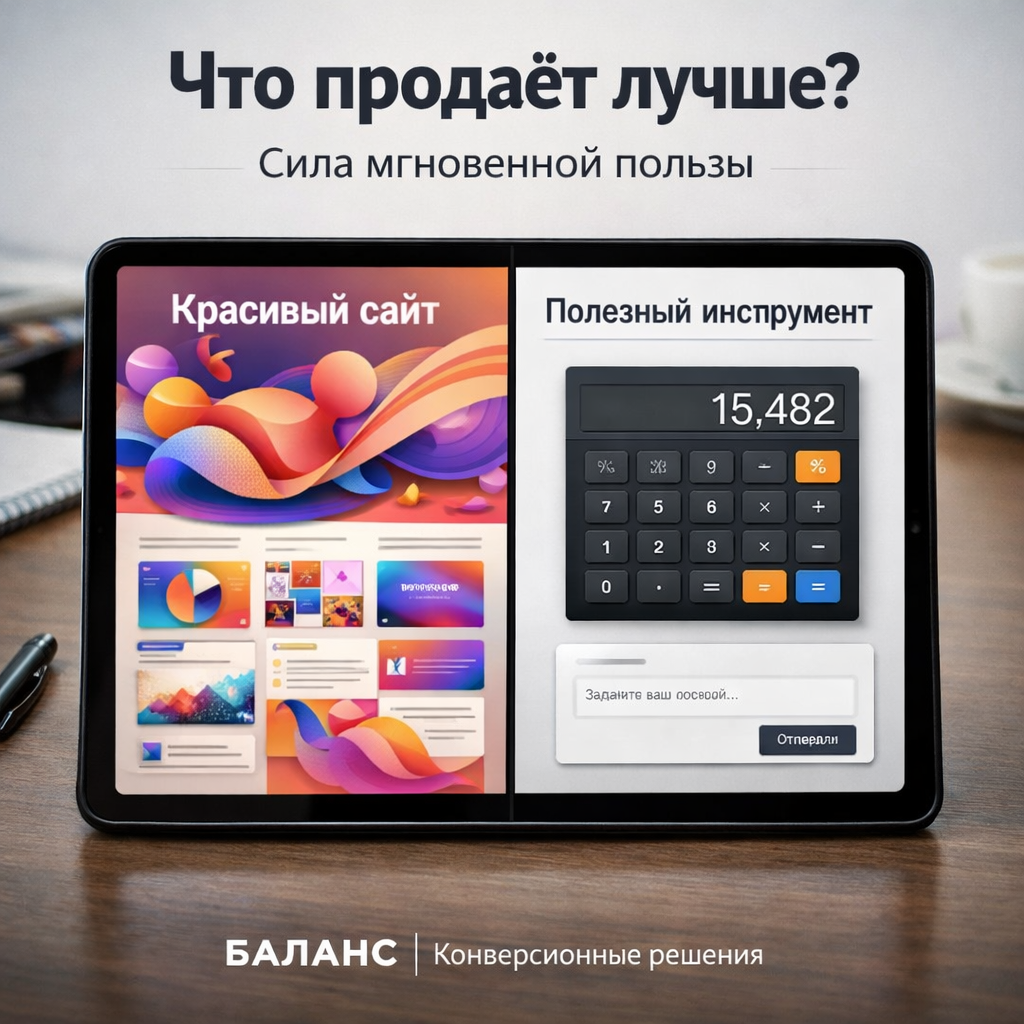 Ваш сайт может быть шедевром дизайна, но если он не решает задачу клиента за 15 секунд, он проигрывает одной кнопке в Telegram. Вступление: Представьте, что вы ищете компанию для остекления балкона. Вы заходите на два сайта. Сайт А: Стильный, с параллакс-эффектами, видео в 4K, где счастливые люди пьют кофе на идеальной лоджии. В разделе «Услуги» — 10 страниц текста про виды профилей. Контакты и форма заявки — в самом низу, в футере. Сайт Б: Лаконичный. На первом же экране — заголовок «Рассчитайте стоимость остекления за 30 секунд» и калькулятор: 4 пункта (тип балкона, размер, материал, остекление). Вы кликаете, получаете примерную сумму. Ниже — кнопка «Обсудить детали с менеджером в Telegram».