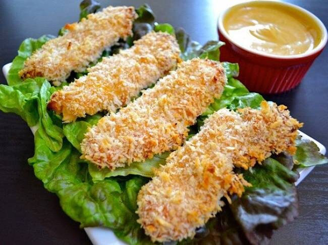 В миске смешиваем йогурт, горчицу, чесночный порошок, перец. Перемешиваем до однородной массы, затем пробуем и приправляем солью по вкусу. Соус нужно разделить на две части. Половина будет в качестве маринада и половина будет соус для макания. Теперь переходим к курице. Каждую грудку нужно нарезать по диагонали ломтиками по 1.5-2 см шириной. Выложить ломтики курицы в миску или пакет для маринования, и сверху залить его первой половиной соуса, чтобы все кусочки были промазаны. Оставить мариноваться минимум на 30 минут, можно оставить на ночь. Перед приготовление разогреваем духовку до 220 градусов. Для приготовления наггетсов в духовке нужно взять противень и накрыть его фольгой. Сверху фольги можно положить решетку (такая решетка может использоваться для гриля в духовке). На решетку выкладываем ломтики курицы. Каждый ломтик нужно обвалять в панировке из сыра и отрубей и выложить на решетку (или просто на фольгу, если у вас нет решетки). После того как все наггетсы выложены, ставим форму в духовку и запекаем в течение 20-25 минут до готовки курицы или пока не станут золотистого цвета.