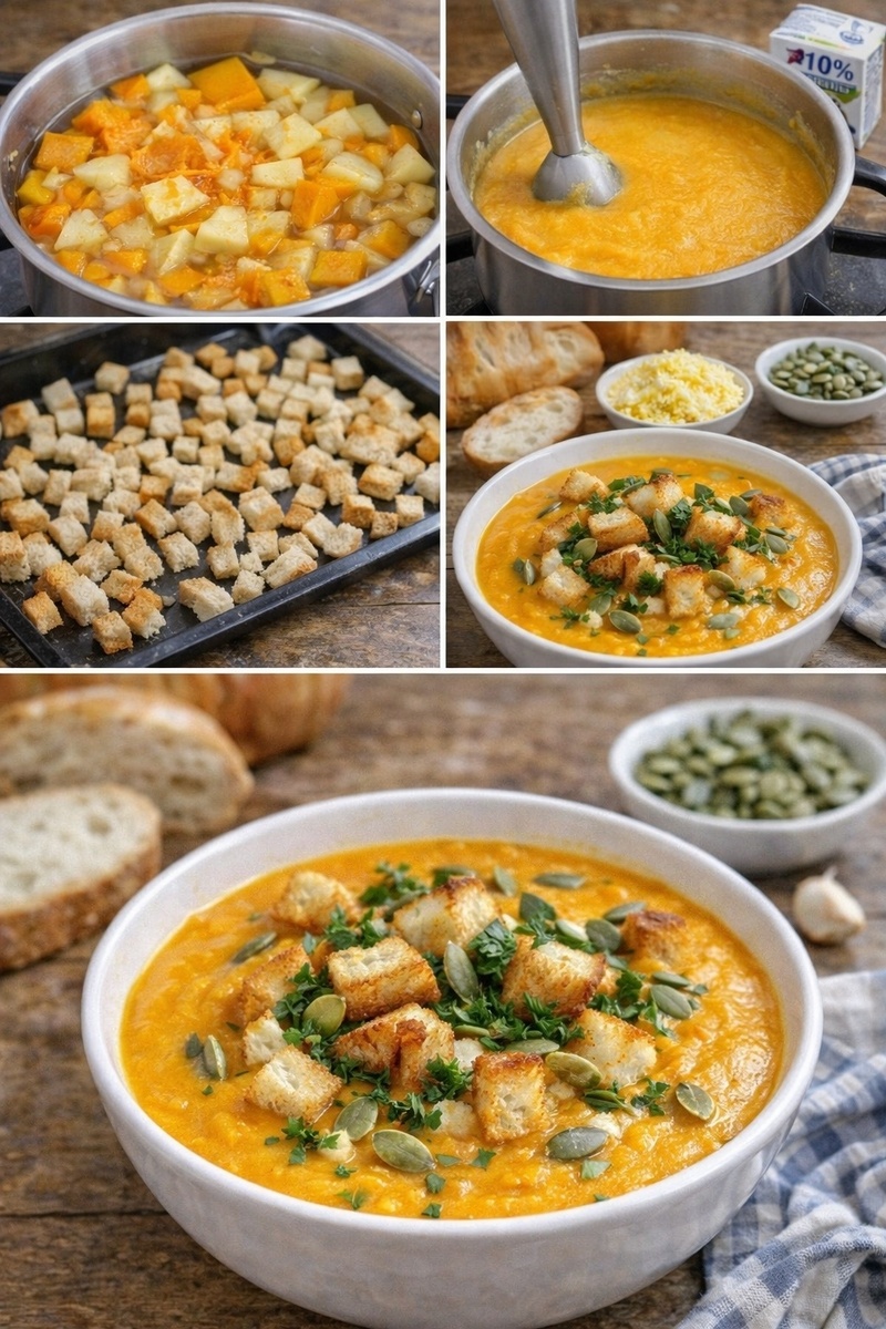 🍲 питательный, мягкий и очень ароматный. Сегодня я приготовила великолепный тыквенный суп-пюре, который не только радует вкусом, но и насыщен витаминами, клетчаткой и минералами. Тыква богата бета-каротином, железом, калием, магнием, а также витаминами С, Е и группы В, благодаря чему это блюдо прекрасно подходит для детского рациона.