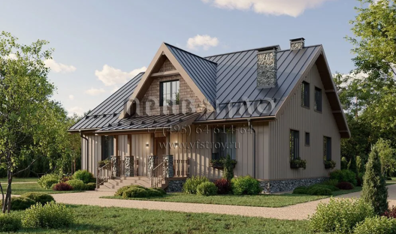 Расшифровка названия проекта: 268-237-1М: порядковый номер проекта 268, общая площадь 237 квадратных метров, 1 полноценный этаж, наличие мансардного этажа