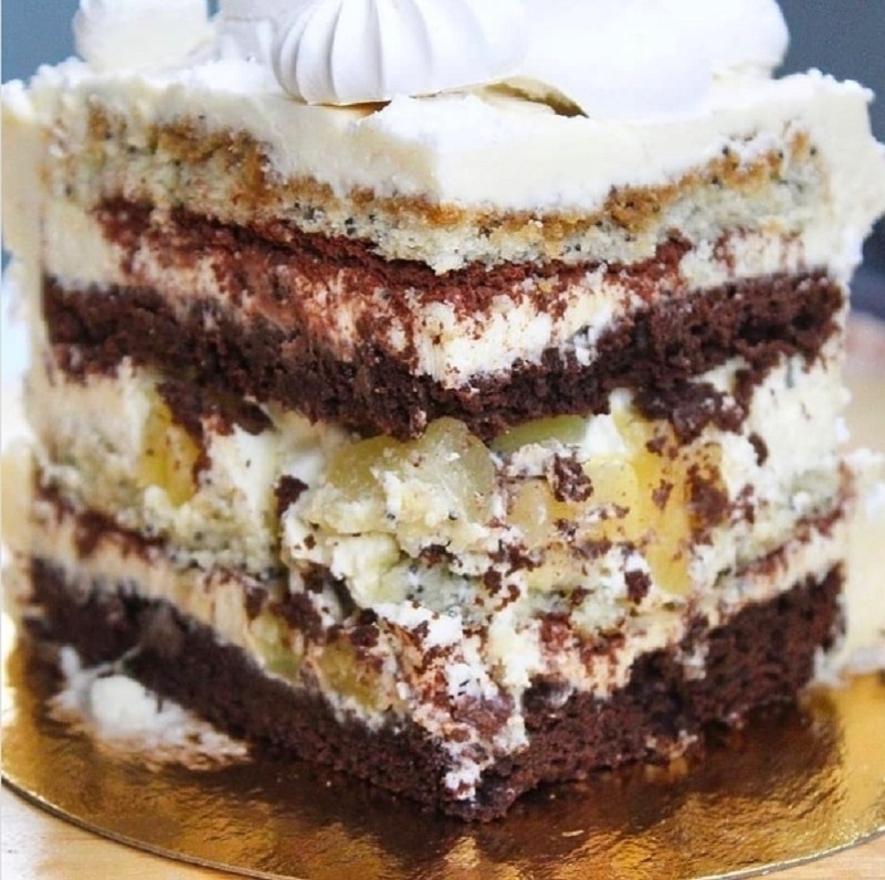 Шоколадный корж пропитываем кофе,промазываем кремом,присыпаем тертым шоколадом,накрываем белым коржом,пропитываем соком от ананасов ,кладём порезанные кусочки ананаса,промазываем кремом. Далее шоколадный бисквит,кофейная пропитка,крем,тертый шоколад,белый бисквит. Промазать бока оставшимся кремом.