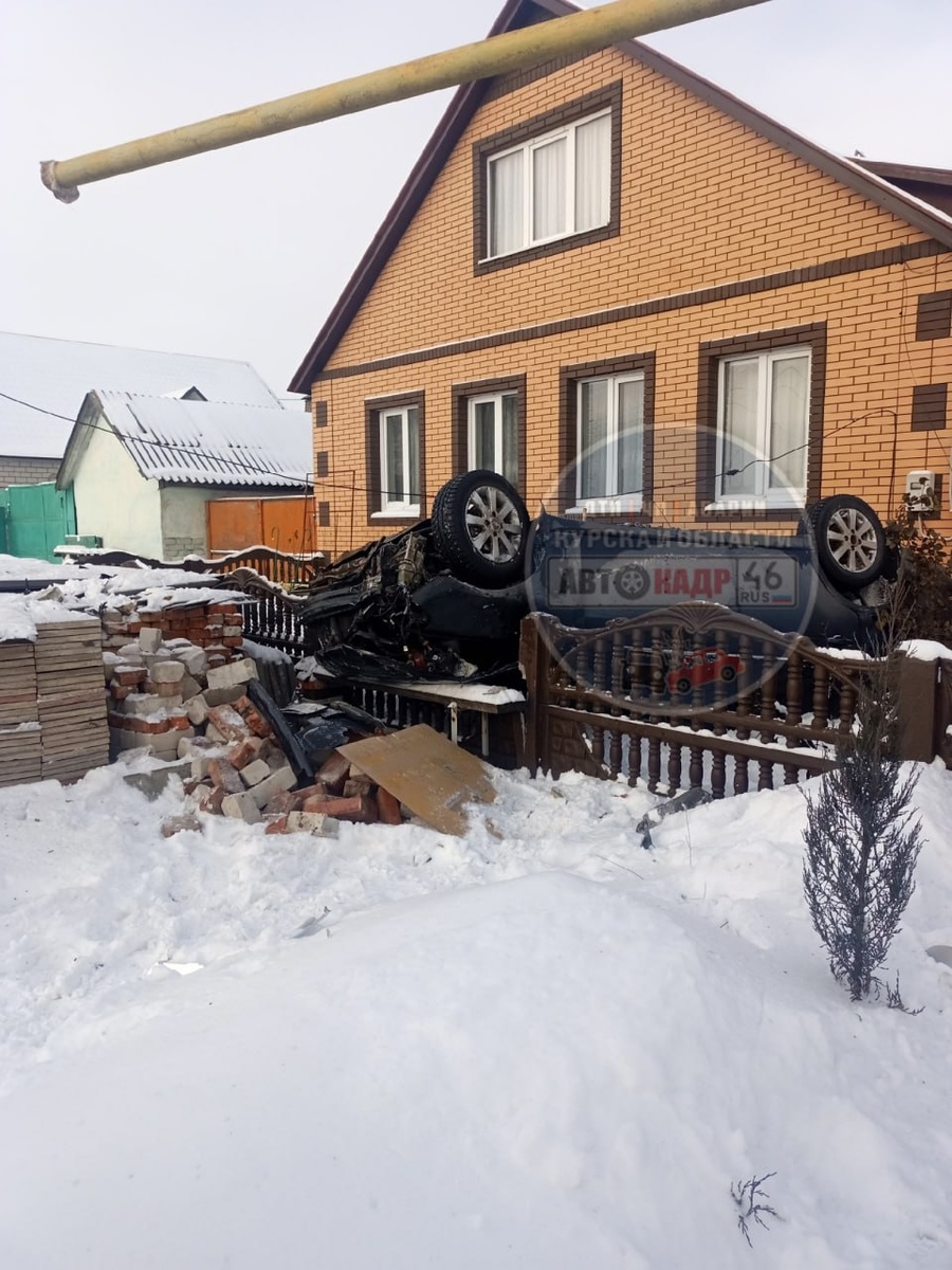 Под Курском автомобиль пробил забор дома и опрокинулся в палисадник