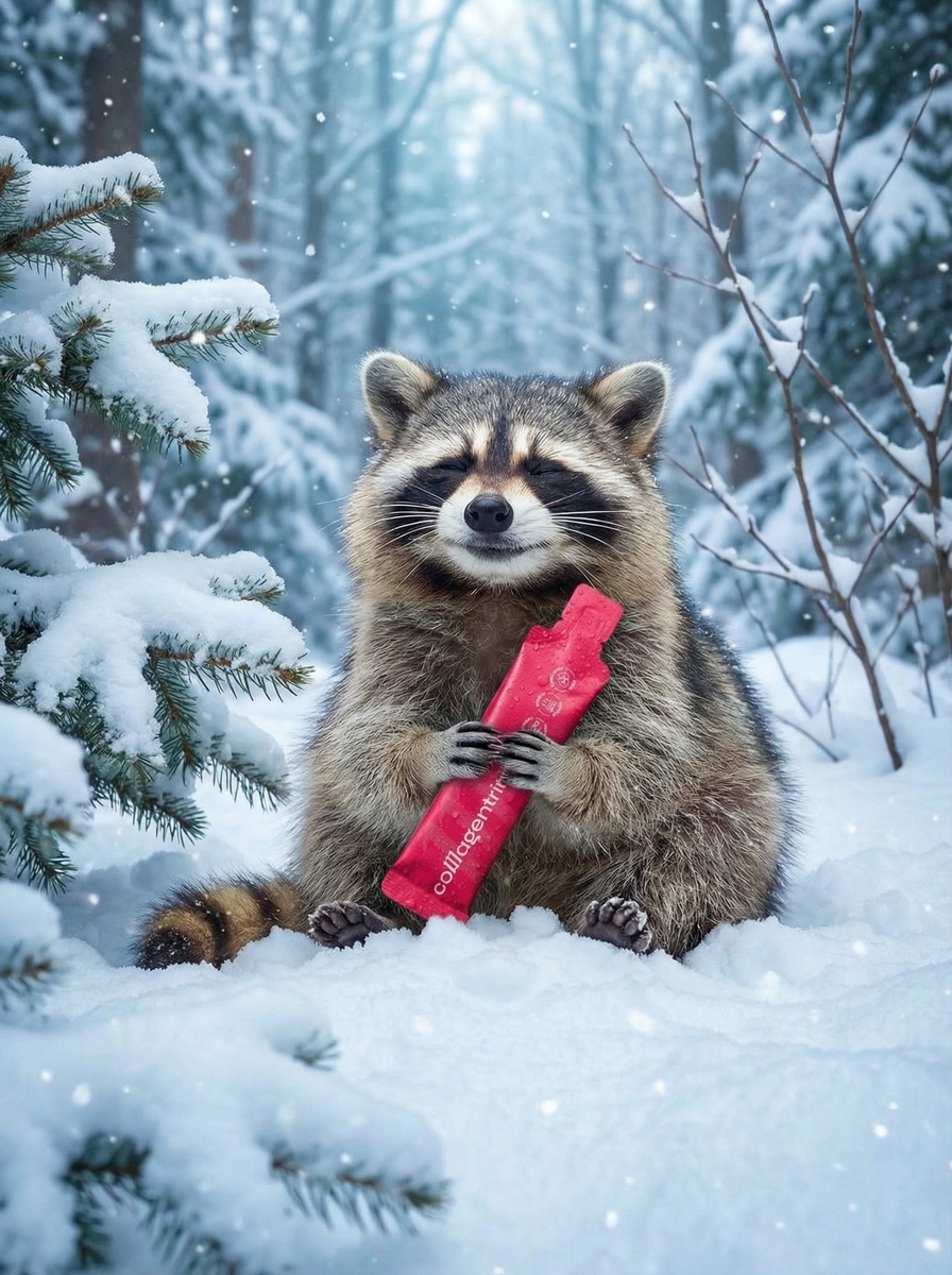«Фотореалистичный енот уютно сидит в снегу, бережно держит в лапках [ваш товар], на котором написано "[ключевое слово]" фиолетовым цветом. Вокруг пушистый снег, зимний лес, снежные ветки и мягкое голубоватое зимнее освещение. Енот выглядит безмерно счастливым, глаза слегка прикрыты от удовольствия.»