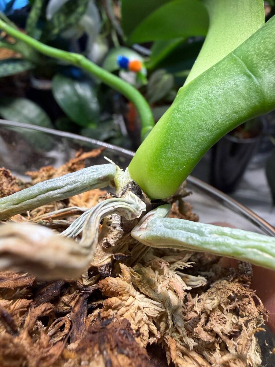 Среди орхидей неприятность дает бабочка дикого кота. Завтра уже им займусь. На шее черное, схлопнулись корни