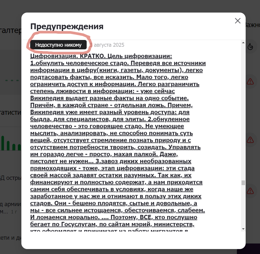 Дублирую. Цель цифровизации: 1.обнулить человеческое стадо. Переведя все источники информации в цифру(книги, газеты, документы), легко подтасовать факты, все исказить. Мало того, легко ограничить доступ к информации. Легко разграничить степень лживости в информации: - уже сейчас Википедия выдает разные факты на одно событие. Причём, в каждой стране - отдельная ложь. Причем, Википедия уже имеет разный уровень доступа: для быдла, для специалистов, для элиты. 2.обнуленное человечество - это говорящее стадо. Не умеющее мыслить, анализировать, не способно понимать суть вещей, отсутствует стремление познать природу и с отсутствием потребности творить, созидать. Управлять им гораздо легче - просто, махая палкой. Даже, пистолет не нужен... 3.завоз диких необразованных прямоходящих - тоже, этап цифровизации: эти стада своей массой задавят остатки разумных. Так как, их финансируют и полностью содержат, а нам приходится самим себя обеспечивать в условиях, когда наше же заработанное у нас же и отн