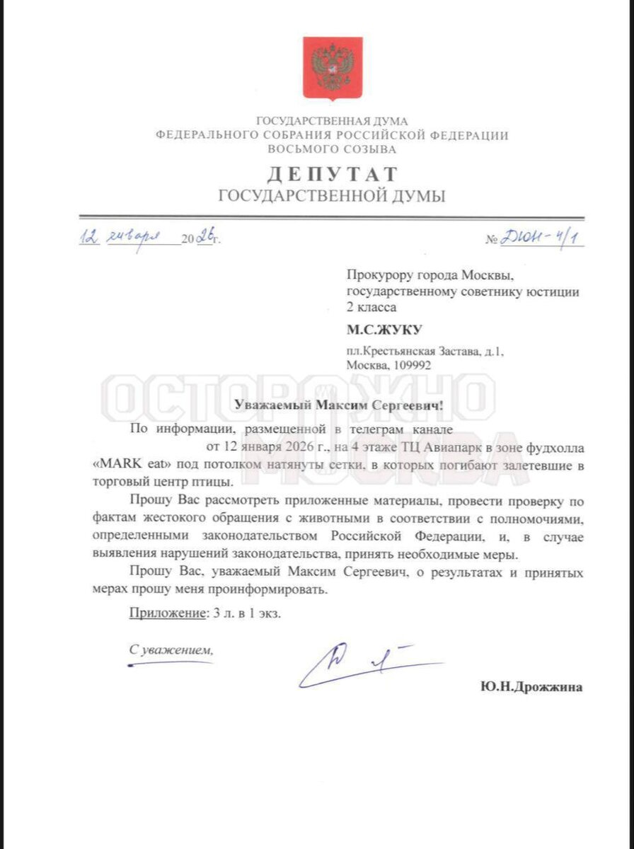 В сети появилось видео с фудкорта, где под потолком установлены сети — в них застревают и погибают птицы. Депутат Госдумы Юлия Дрожжина направила запросы в прокуратуру, МВД и Роспотребнадзор с просьбой провести проверку и дать правовую оценку возможному жестокому обращению с животными. Подписаться на Подмосковье сегодня