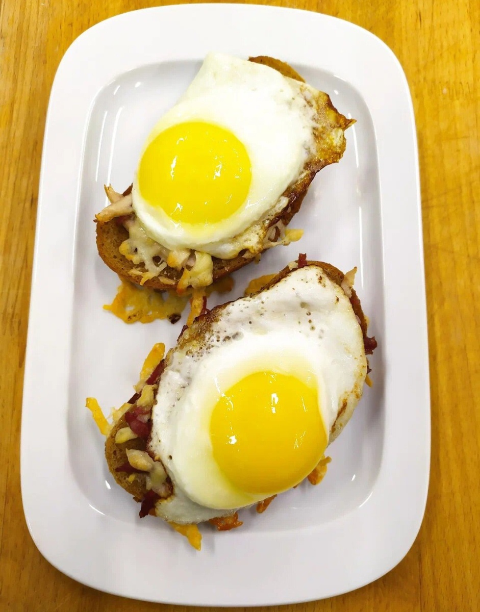 Сыр натереть на крупной тëрке, ветчину нарезать соломкой, смешать, выложить на ломти хлеба, поставить запекатьс в духовку, разогретую до 200С на 5-7 мин. Пока бутерброды запекаются, пожарить 2 яйца, посолить, поперчить. Выложить яйца на готовые бутерброды и есть горячими!