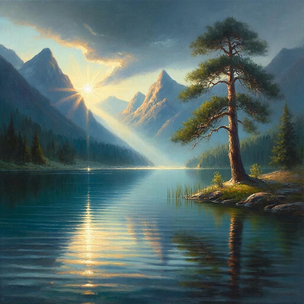 Давным-давно, в одной долине, окружённой горами, соперничающими друг с другом по высоте, лежало Озеро. Каждое утро оно просыпалось и смотрело на свои воды — но видело в них лишь отражение других. То сравнивало свою гладь с ослепительной снежной вершиной, что блистала в лучах солнца. То завидовало ручью, что звонко и беззаботно скакал по камням. То грустило, глядя на старую сосну на берегу — такую мудрую, укоренённую, знающую тайны ветров. «Я — просто тихая вода. У меня нет ни высоты, ни движения, ни мудрости веков». Оно старалось рябью подражать бегу ручья, окрашивалось в чужие краски заката, пыталось удержать на себе отражение самой красивой горы. Но когда облака закрывали солнце, а горы скрывались в тумане, Озеро чувствовало пустоту и снова опускало «взгляд» на илистое дно, на тёмную глубину. Но однажды вдруг случилось нечто особенное. В самую тихую, безлунную ночь, когда ни одна звезда не отражалась на его поверхности, Озеро заглянуло внутрь себя. И там, в самой глубине, среди тёмно
