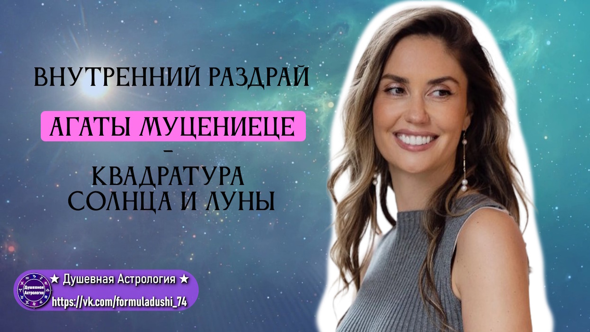 У Агаты Муцениеце в космограмме есть непростой аспект, который порождает постоянный внутренний конфликт, раздрай, напряжение. Это квадратура Солнца в Рыбах и Луны в Стрельце.