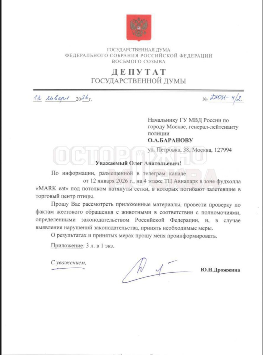 🐦 Полицию и прокуратуру Москвы просят проверить ТЦ Авиапарк из-за ловушек, в которых погибают птицы