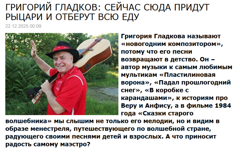 Григория Гладкова называют «новогодним композитором», потому что его песни возвращают в детство. Он – автор музыки к самым любимым мультикам «Пластилиновая ворона», «Падал прошлогодний снег», «В коробке с карандашами», к историям про Веру и Анфису, а в фильме 1984 года «Сказки старого волшебника» мы слышим не только его мелодии, но и видим в образе менестреля, путешествующего по волшебной стране, радующего своими песнями детей и взрослых. А что приносит радость самому маэстро?