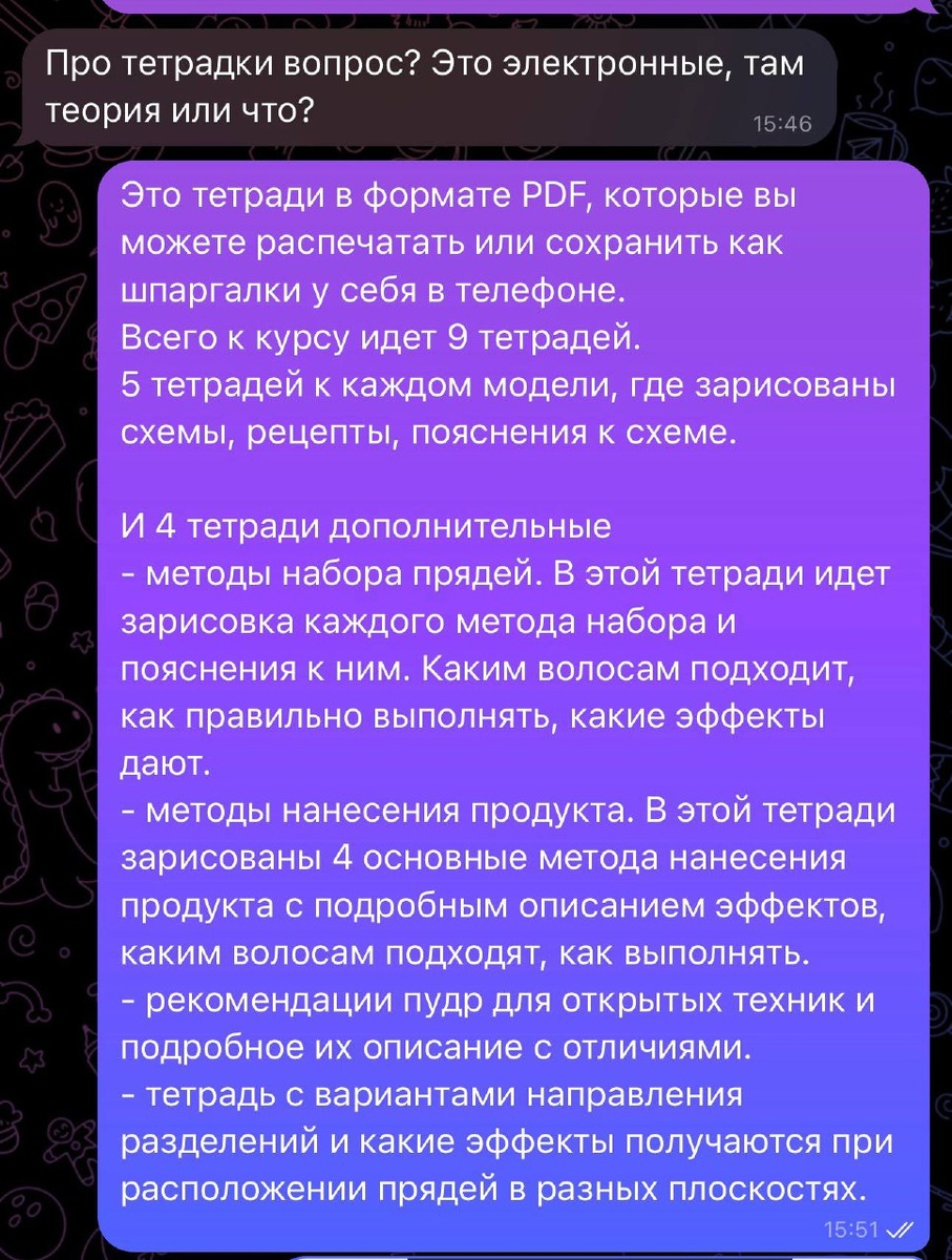 Менеджер прислал вопросы мастера и я подумал, что будет круто поделиться и с вами, ведь у кого-то тоже такие вопросы могут быть🤌🏻 ИТАК В моем курсе есть не только онлайн уроки (видео) но и 9 рабочих тетрадей! И тетради это не просто «пересказ», а дополнение к роликам! Это позволяет расширить получаемую информацию!