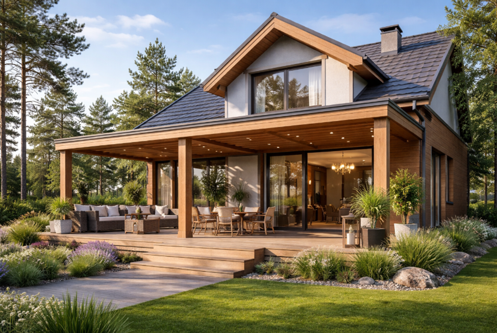 Добавление террасы сегодня рассматривается не только как архитектурный приём, но и как фактор, влияющий на теплотехнические характеристики здания. Грамотно спроектированный дом с террасой может получить дополнительные преимущества по защите ограждающих конструкций от ветра, перегрева и избыточных теплопотерь, что напрямую отражается на энергопотреблении в течение года и стабильности микроклимата в жилых помещениях. Терраса, примыкающая к фасаду, частично экранирует наружные стены от прямого воздействия ветра и осадков. Это снижает конвективные теплопотери и уменьшает охлаждение поверхностей в холодный период. При правильной ориентации по сторонам света навес или крыша террасы также работает как солнцезащитный экран летом, сокращая перегрев помещений и нагрузку на системы охлаждения. Ключевые эффекты: В результате терраса становится не просто архитектурным элементом, а частью теплового контура здания, формируя более стабильную и предсказуемую работу ограждающих конструкций. За счёт сниж