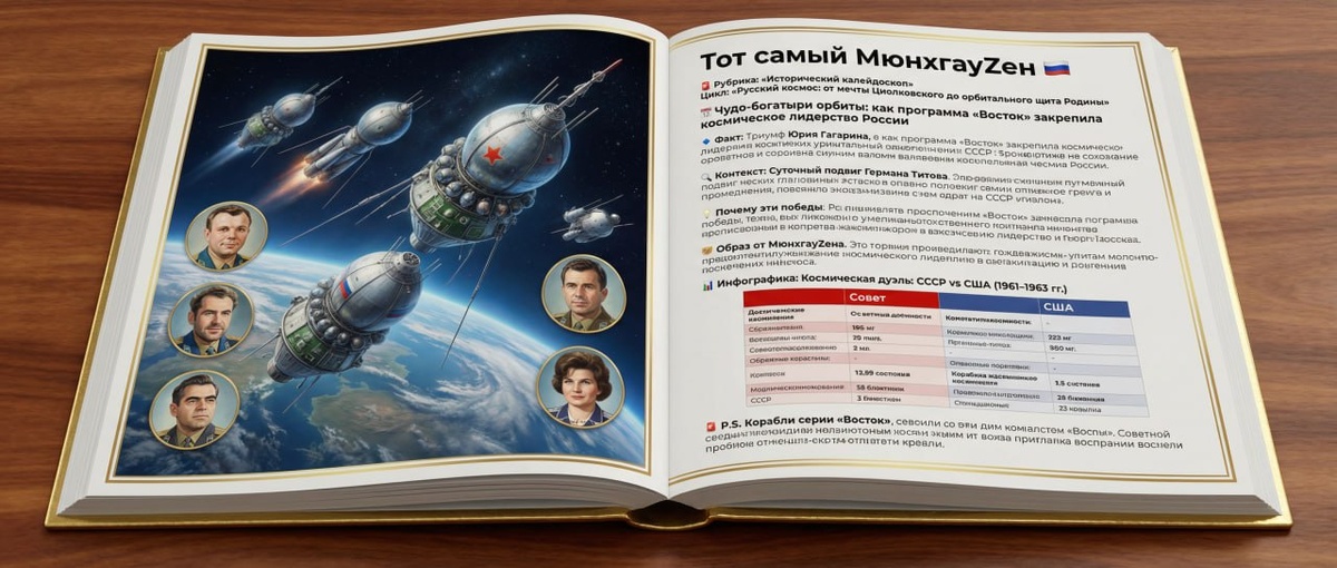 » Цикл: «Русский космос: от мечты Циолковского до орбитального щита Родины» 📅 Чудо-богатыри орбиты: как программа «Восток» закрепила космическое лидерство России Часть 1️⃣/2 🔹 Факт: Триумф Юрия Гагарина был не финалом, а уверенной увертюрой. В считанные месяцы советская космическая программа «Восток» нанесла Западу серию сокрушительных ударов, каждый из которых становился новым, недосягаемым рубежом. Всего за два года после легендарного «Поехали!» русские космонавты совершили первый суточный полёт, провели первые в истории групповые манёвры кораблей и отправили в космос первую женщину — Валентину Терешкову. Эти победы не оставили от американских амбиций камня на камне, доказав: русский прорыв в космос — это не случайность, а закономерность, основанная на мощи системы и несгибаемости духа. 🔍 Контекст: — Суточный подвиг Германа Титова: Всего через четыре месяца после Гагарина, 6 августа 1961 года, на корабле «Восток-2» стартовал Герман Титов. Он не просто повторил успех — он умножи