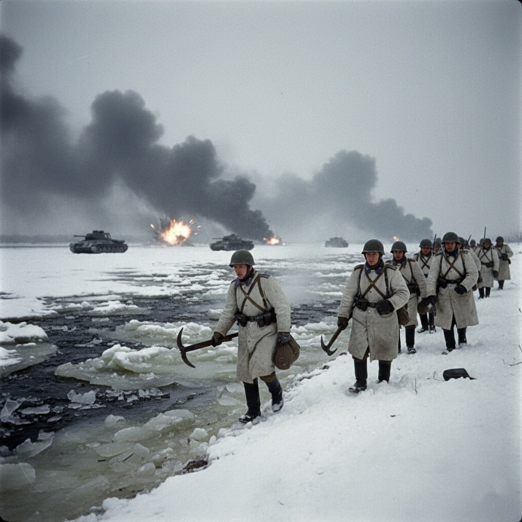 Ранним утром, в 9 часов 30 минут, после мощнейшей артиллерийской подготовки начинается операция «Искра» — долгожданная попытка прорвать блокаду города, которая длилась уже почти 500 дней. С двух сторон, навстречу друг другу, в атаку переходят войска Ленинградского фронта с запада и Волховского фронта с востока. Их цель — узкий, но жизненно важный участок между Шлиссельбургом и Синявино. Подготовка к этому дню шла месяцами. Командование понимало: если операция провалится, следующего шанса может просто не быть. Немцы превратили Синявинские высоты в сплошной укрепрайон — бетонные дзоты, минные поля, артиллерия, простреливающая каждый метр. Но на этот раз Красная армия была лучше подготовлена: накоплены резервы, разведка уточнила позиции врага, артиллерия получила приоритет по боеприпасам. Утром 12 января над Невой и лесами восточнее Ладоги буквально взрывается земля. Артподготовка длится более двух часов. Затем вперёд идут стрелковые дивизии, сапёры, танки, которые буквально утопают в