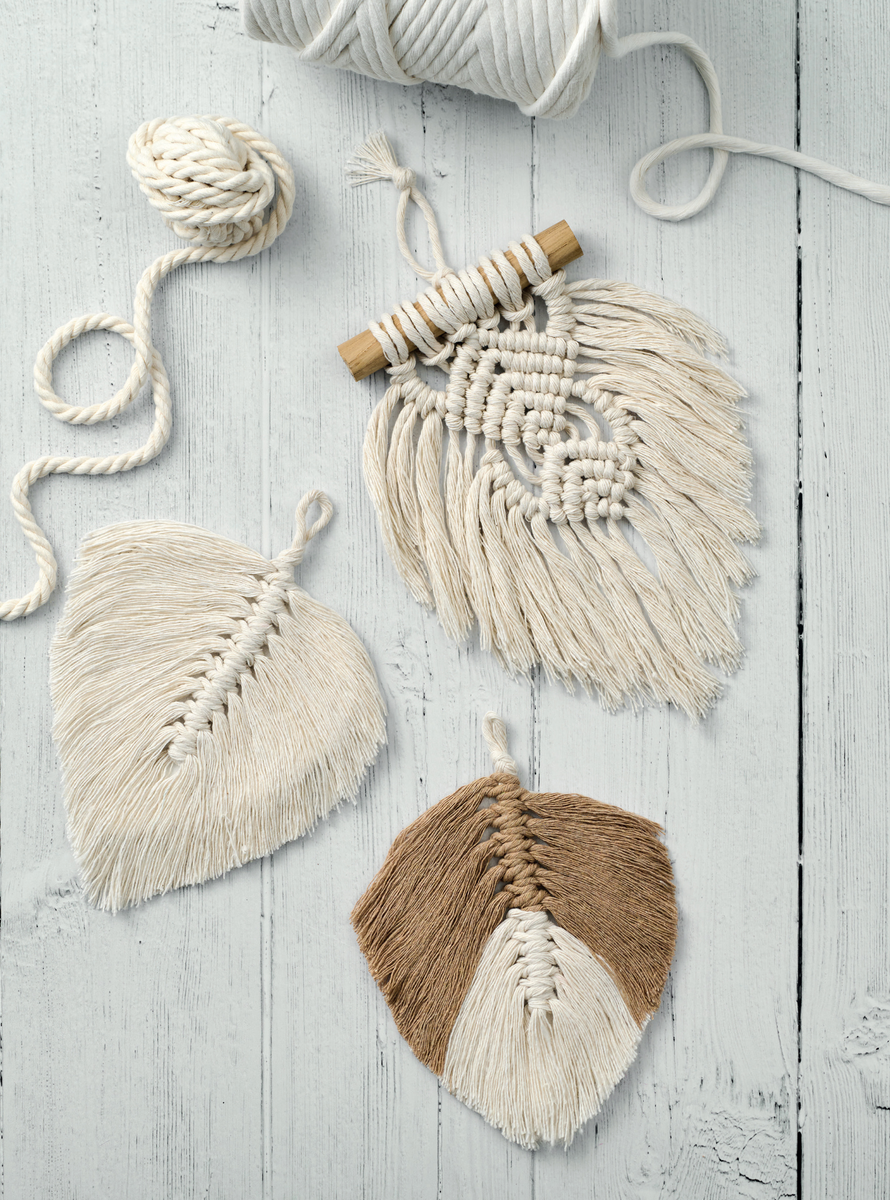 Макраме с нуля и все наши статьи про макраме здесь. Мы продолжаем цикл статей, посвящённых маленьким, но очень эффектным макраме-проектам, которые идеально ложатся на стол и не требуют много материала. Сегодня — перо и лист: два аксессуара, которые плетутся за вечер, используют обрезки верёвки и превращают любой интерьер в природный уголок. Особенно хороши для новичков — минимум узлов, максимум удовольствия от результата. • 3,8 м верёвки основного цвета толщиной 3 мм