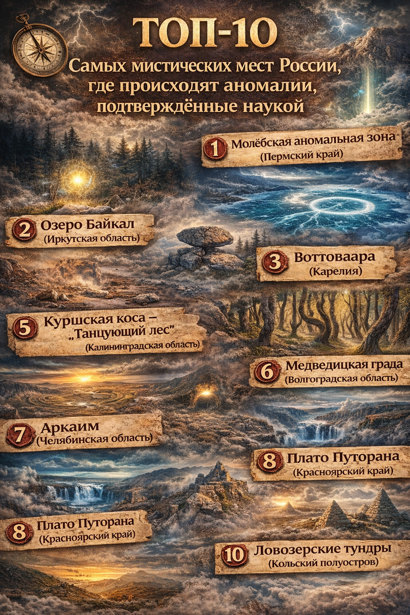 Строго выверенный список: не фольклор и «байки», а места в России, где зафиксированы аномалии, подтверждённые научными исследованиями (геофизика, биология, археология, медицина, физика). Именно поэтому они считаются мистическими. (аномалии подтверждены наукой) Подтверждённые аномалии: 🔬 Исследовали: РАН, геофизики