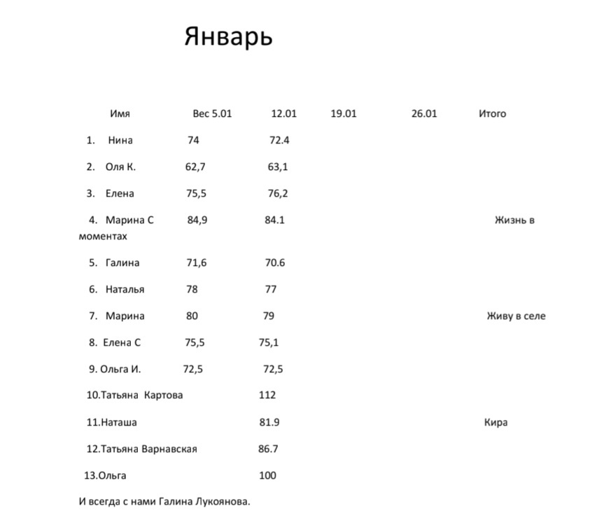 Здравствуйте, дорогие друзья и гости канала. Вот и прошла первая неделя нашего марафона. Сегодня все активно написали свой вес. И рост, и возраст. Даже некоторые написали, откуда они. По настроению девочек чувствуется, что они настроены худеть. За эту неделю мы все дружненько скинули 4,6 кг веса. Это трудная неделя, потому что мы все отмечали праздник. Но несмотря на это, девочки держались. Я вас всех поздравляю. Еще Ольга Д присоединилась. Вес 75 кг. Оля, извините, таблица была уже сделана. Но вы уже с нами. Общайтесь, делитесь, спрашивайте. Кто-то худеет с подсчетом калорий, кто-то уменьшает порции. Я всю неделю считала калории. И мое мнение такое. Это утомительно. Можно попробовать недельку с подсчетом, чтоб увидеть, какая еда должна быть и сколько. У Малышевой калории никто не считал. На это много времени уходит. И мне даже жаль того времени, что я на это потратила. Но, это только мое мнение. В бассейн я сегодня не ездила. У нас целый день метет. Поливала цветы на вором этаже и