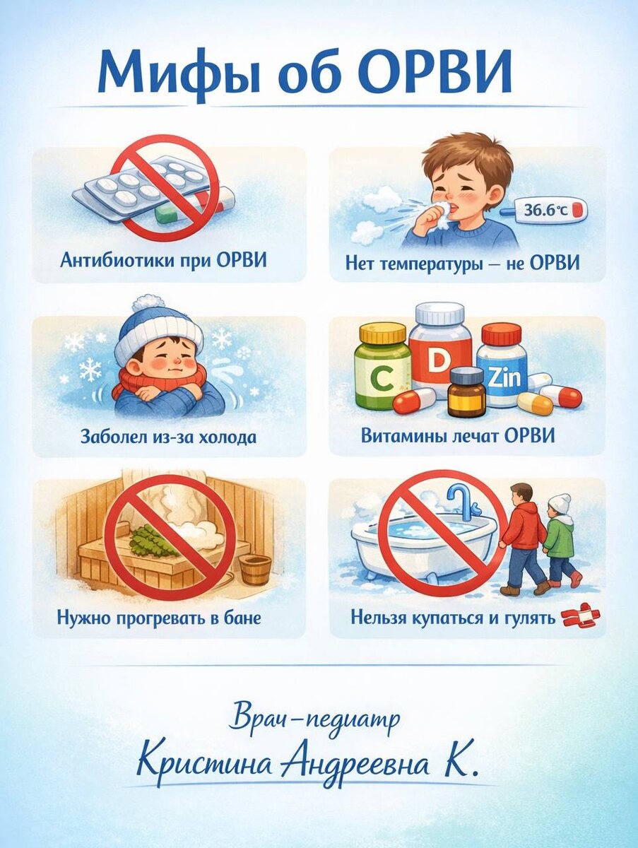 ➖➖➖➖➖➖ ОРВИ остаются одной из самых частых причин обращения к врачу. Несмотря на это, вокруг заболевания по-прежнему существует множество мифов. Миф 1️⃣ОРВИ требует назначения антибиотиков 👉ОРВИ имеет вирусную этиологию. Антибактериальная терапия не влияет на течение заболевания и показана исключительно при развитии подтверждённых бактериальных осложнений. Миф 2️⃣Отсутствие лихорадки исключает ОРВИ 👉ОРВИ может протекать без повышения температуры или с субфебрилитетом. Диагноз основывается на совокупности клинических симптомов, а не только на наличии лихорадки. Миф 3️⃣Переохлаждение является причиной ОРВИ 👉Причиной ОРВИ являются вирусы. Переохлаждение может способствовать снижению местного иммунитета, однако не является непосредственной причиной заболевания. Миф 4️⃣Витамин C, цинк, витамин D и иммуномодуляторы лечат ОРВИ 👉На сегодняшний день нет убедительных доказательств того, что витамины или большинство иммуномодуляторов значительно сокращают длительность или тяжесть течения