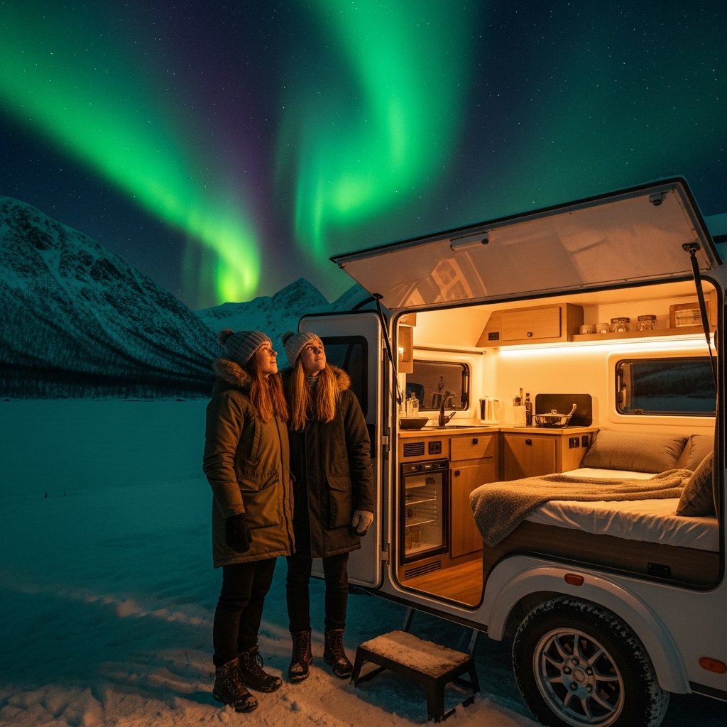 Автодом или прицеп-караван кардинально улучшает условия зимнего автотура. Мобильное жильё обеспечивает тёплое убежище, возможность приготовления пищи и комфортный отдых между сеансами наблюдения за северным сиянием. Семьи с детьми особенно оценят возможность обеспечить малышам комфортный сон, пока взрослые ведут охоту за Aurora Borealis.