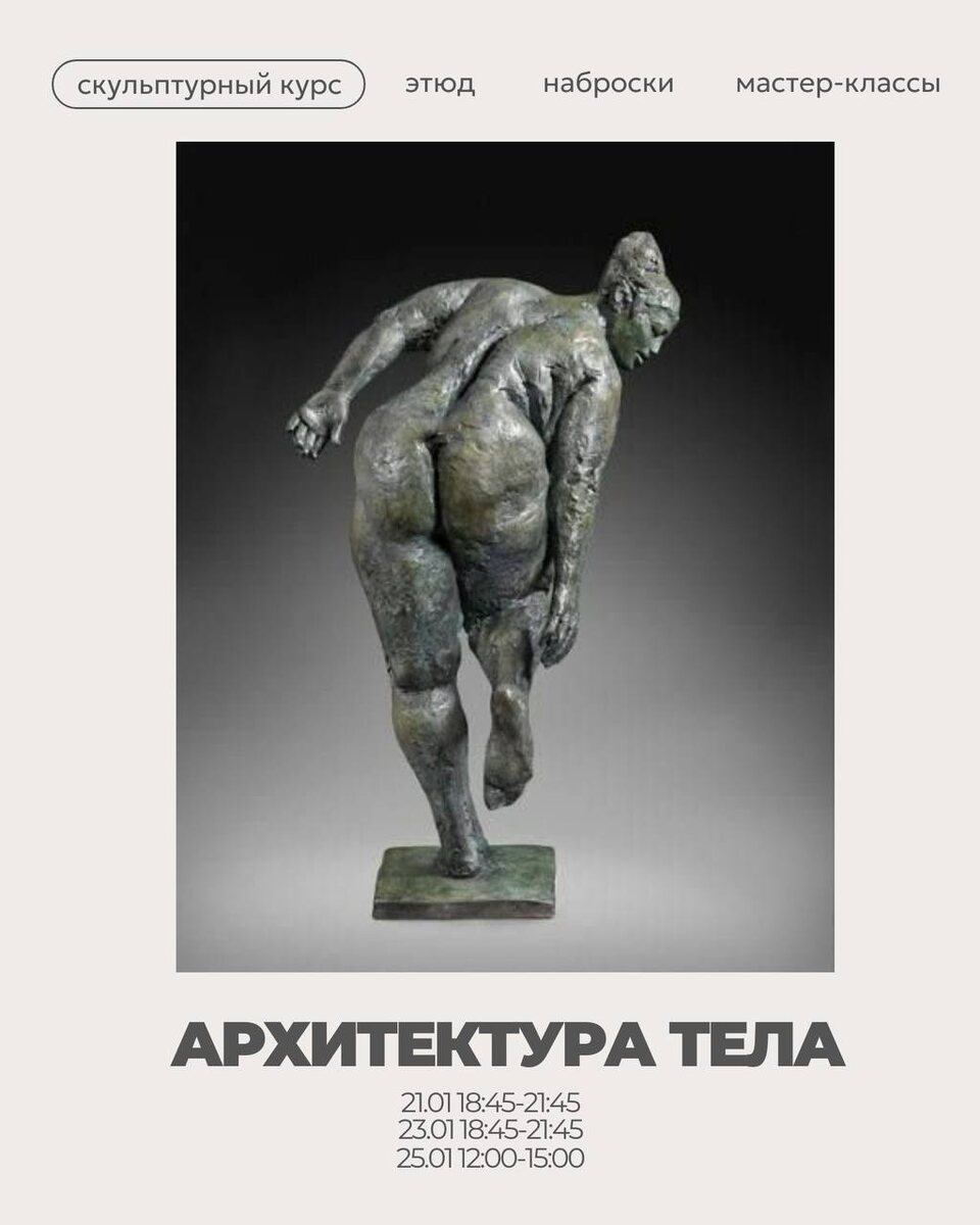 : 👉 учиться лепить с каркасом и работать с пластилином; 👉 восхищаться формами модели, разбирать пластическую пластику, пропорции, движение и свет; 👉 работать над композицией и текстурой поверхности; 👉 создавать фигуру женщины высотой примерно 45 см, передавая характер и форму натуры. 21.01 18:45–21:45 23.01 18:45–21:45 25.01 12:00–15:00 Скульптурный курс «Архитектура тела»