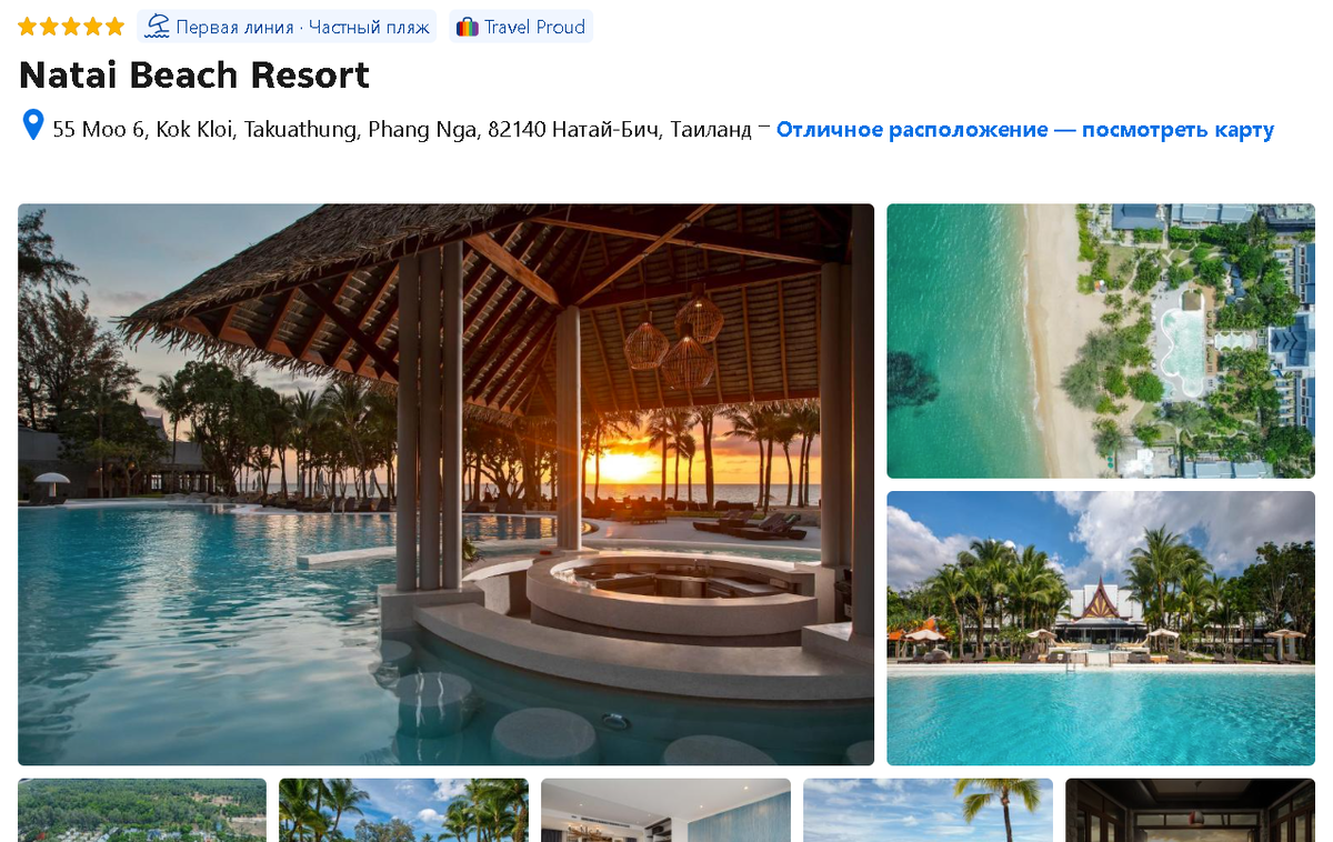 В 5-ти звездочном Natai beach resort есть как отдельные номера, так и домики вдоль океана, которые дороже, но цена стоит того. У каждого домика есть по 2 лежака и столик с креслами, а это значит что не нужно "бороться" за лежаки у бассейна и можно ужинать у себя под звездами и под шум океана.
