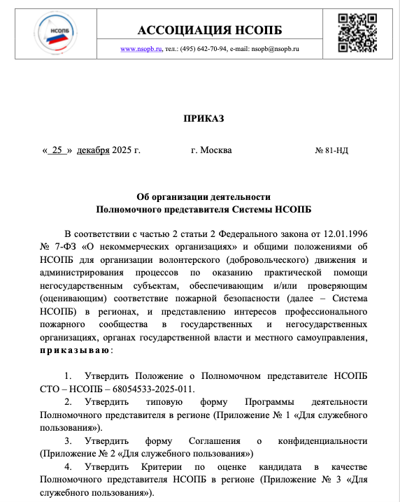 Приглашаем к сотрудничеству для представления интересов в регионе профессионального пожарного сообщества Системы НСОПБ, лиц имеющих активную жизненную позицию по развитию деятельности в области пожарной безопасности. В свою очередь НСОПБ обязуется оказывать всестороннюю поддержку и помощь при осуществлении общественной деятельности. Работа Полномочного представителя НСОПБ в регионе осуществляются по программам, согласованным обоюдно сторонами, при этом не ограничивая свободу действий направленных на достижение целей пожарного сообщества. При необходимости НСОПБ готово организовать подготовку (обучение) кандидатов в Полномочные представители. Одновременно публикуем Приказ НСОПБ № 81-НД от 25.12.2025 г. Приложения к Положению о Полномочном представителе НСОПБ СТО – НСОПБ – 68054533-2025-01: Заявление о рассмотрении кандидатуры в качестве полномочного представителя НСОПБ (Приложение 1);