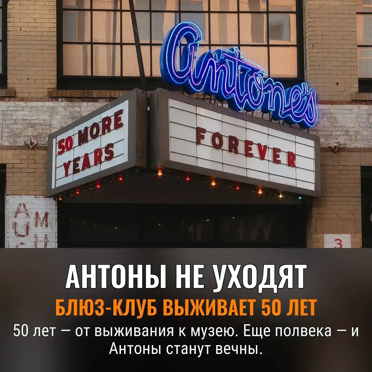 Люди так долго спорят, стоит ли блюзовый клуб в центре города вечности. Теперь у Antone’s — ещё полвека гарантированного существования: арендный договор до 2075-го. Займетесь ностальгией? Пожалуйста, клуб не только не снесут — его верхний этаж превратят в музей «World Famous», а деньги на это дадут чиновники из городского фонда. Запустят даже специальный фонд для будущих мероприятий. О, как чинно вы празднуете своё прошлое, когда бумагами подписана память и выстрадано право жить в бетонной коробке. Попробуйте ещё вспомнить, кто такой Клиффорд Антон — основатель всего этого, первый блюзовый пророк Остина. Он, конечно, верил в бессмертие синкоп. Верьте и вы — ваши инвестиции уже обеспечили очередную коллекцию артефактов для потомков. Слава музею, который живёт и днём, и ночью, чтобы просвещать и зарабатывать.🎶 Узнать подробности