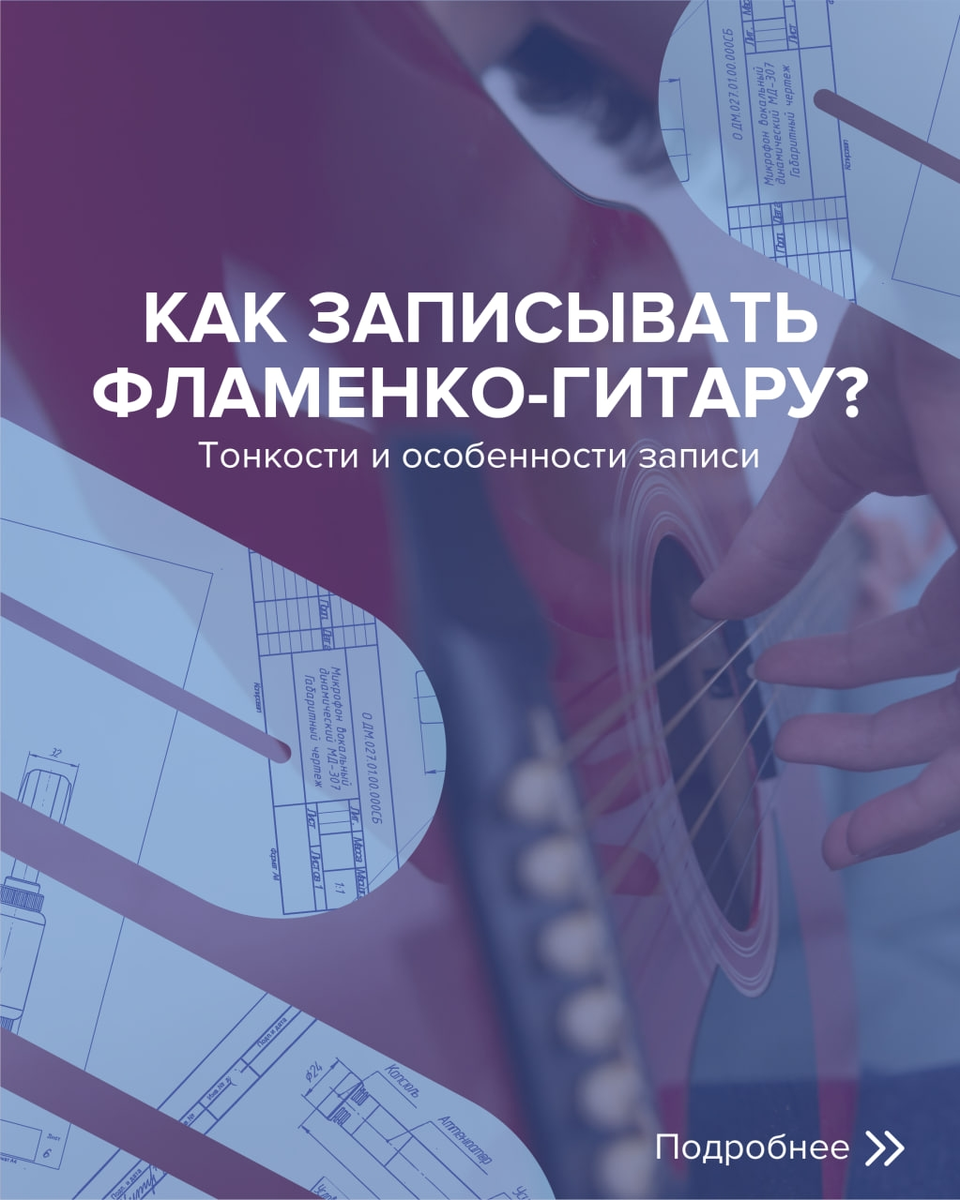 Гитара фламенко — один из самых сложных инструментов для записи. В ней сочетаются резкая атака, широкая динамика, перкуссионные элементы и богатый средний диапазон. Ошибка в выборе микрофона или просчёт в позиции мгновенно делают звук либо слишком жёстким, либо плоским, безжизненным и картонным. Первый ключевой момент — микрофон. Чаще всего используют конденсаторные микрофоны с малой диафрагмой, они точно передают атаку, детали исполнения и сложные артикуляции. Первый кандидат на эту роль МК-012. Большая же диафрагма добавляет тела и тепла, но требует аккуратного позиционирования, чтобы не перегрузить низ и нижнюю середину. Попробуйте разные микрофоны — МК-117, МКЛ-112 и подобные. Ленточные микрофоны применяют реже, но они могут отлично смягчить агрессивный верх при яркой манере исполнения. В этом случае МЛ-52-02 вам в помощь. Расположение микрофона. Классическая точка — не в розетку, а в область между 12-14 ладом и корпусом, под углом к инструменту. Это позволяет сбалансировать атаку