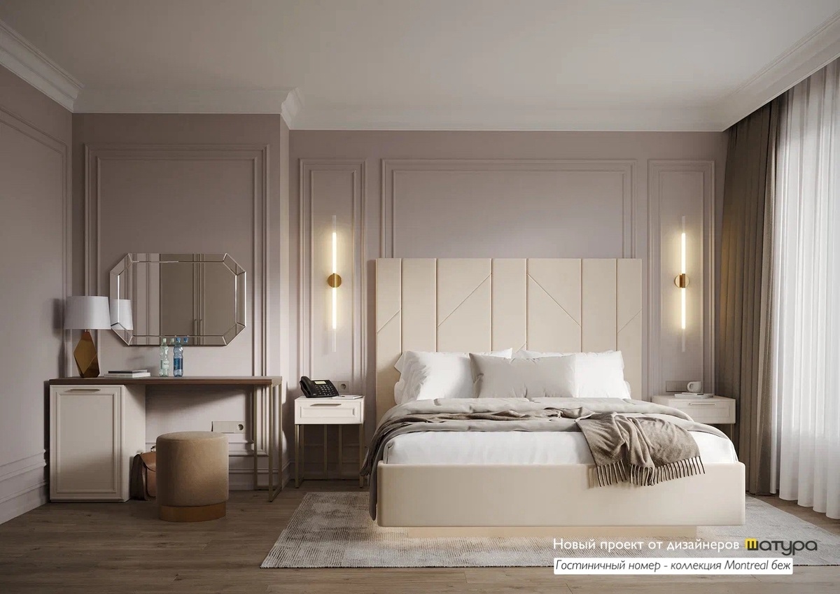 Интерьеры для HoReCa: реализованный проект ШАТУРА с коллекцией MONTREAL✨ ШАТУРА продолжает развивать направление комплексного оснащения объектов HoReCa — гостиниц, апартаментов, санаториев и домов отдыха. В числе реализованных проектов — интерьеры гостиничных номеров, выполненные на базе коллекции Montreal беж. MONTREAL — модульная интерьерная система, сочетающая сдержанный дизайн, актуальные оттенки и функциональные решения для интенсивной эксплуатации. https://www.shatura.com/collections/all/line-is-montreal/?utm_source=vk&utm_medium=post ⭐️Коллекция представлена в трёх цветовых вариантах — белом, бежевом и сером, что позволяет адаптировать интерьер под различные архитектурные концепции: от классики и неоклассики до ар-деко. Бежевая версия, реализованная в проекте, построена на мягкой нейтральной палитре матовых фасадов, дополненных рельефными ручками в цвете Golden Shadow и декоративным профилем из МДФ. Древесная текстура в оттенке Зейдан формирует тёплую, визуально спокойную ат