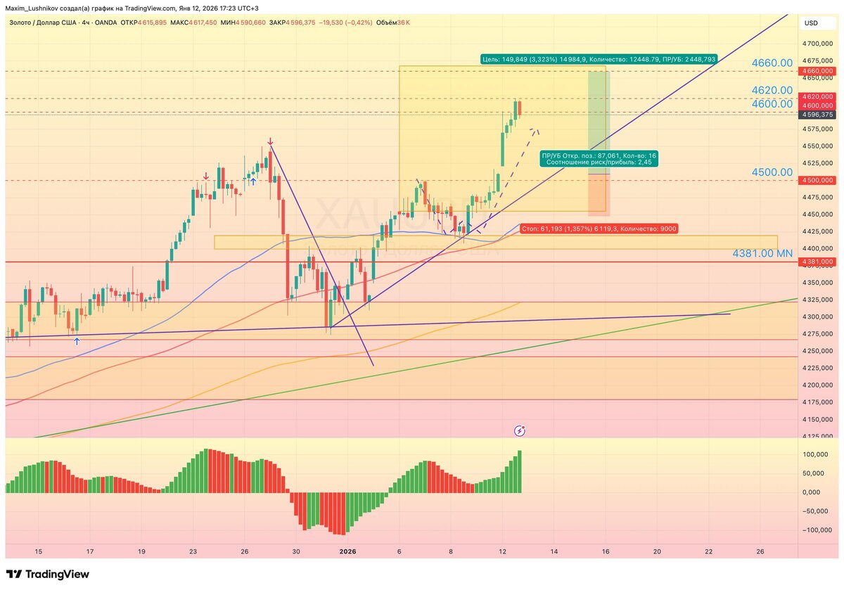 🟡 Золото достигло прошлого хая и даже первые две цели 4600 и 4620.