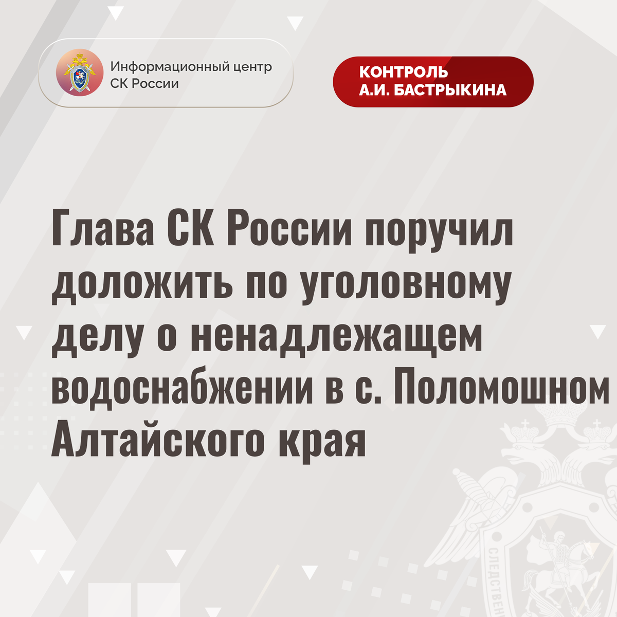 Глава СК России поручил доложить по уголовному делу о ненадлежащем водоснабжении в с. Поломошном Алтайского края В Информационный центр СК России поступило обращение по вопросу нарушения прав жителей села Поломошного Алтайского края на качественное водоснабжение. Для обеспечения домовладений граждан коммунальным ресурсом вблизи населенного пункта более 20 лет функционирует водонапорная башня. В декабре прошлого года из-за поломки насоса жители села вынуждены были оплачивать установку нового оборудования за свой счет, при этом отчет о его стоимости им предоставлен не был. Вместе с тем четыре года назад были выделены бюджетные средства для бурения скважины в целях обеспечения граждан автономным водоснабжением, однако работы выполнены не были. Обращения в профильные структуры результатов не принесли. В СУ СК России по Алтайскому краю возбуждено уголовное дело. Председатель Следственного комитета Российской Федерации Александр Иванович Бастрыкин поручил руководителю СУ СК России по Алтайс
