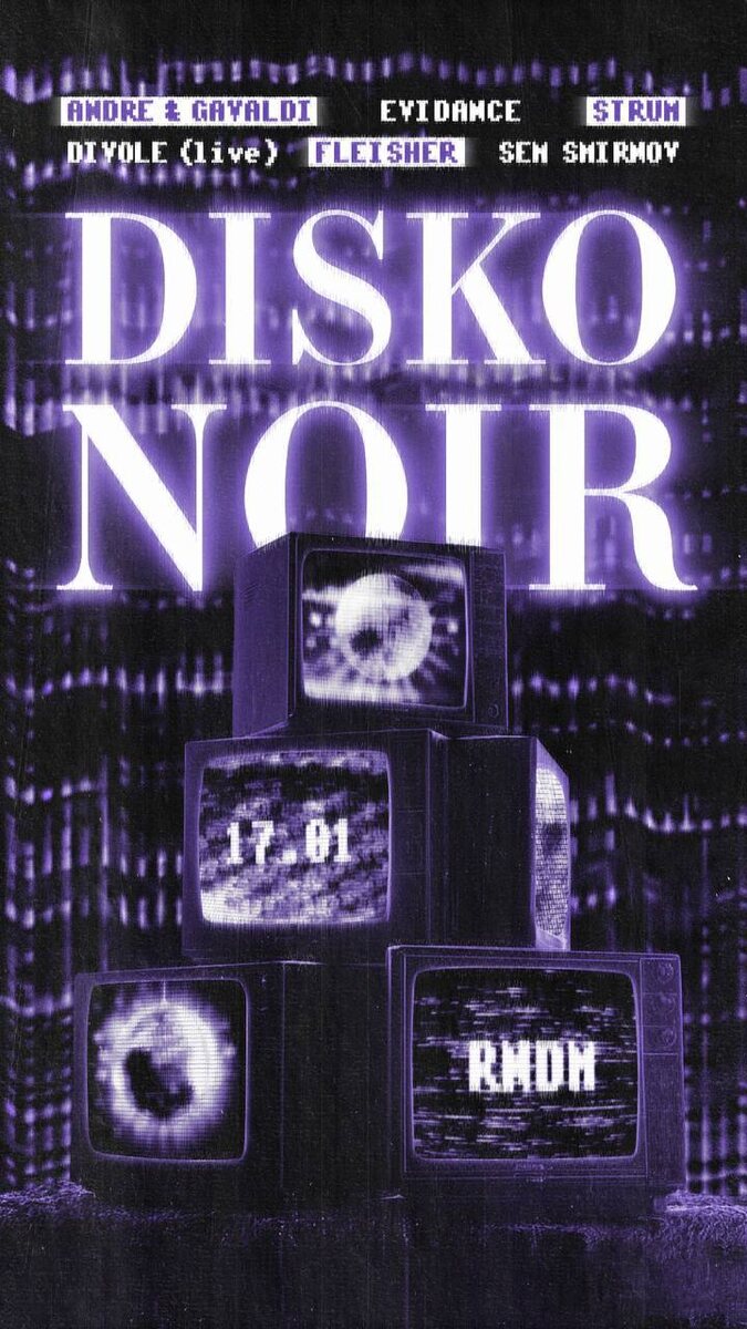 ! 17 января в клубе RNDM вас ждёт ночь тёмной электроники: дарк‑диско, EBM и лайв-выступление от Divole - мастеров гипнотического электронного синтеза с холодным битом и проникновенным вокалом. Также впервые на DiskoNoir выступят Fleisher с её dj-сетом, насыщенным агрессивным и сексуальным грувом и Strum — наш друг из Казани! Lineup: - ANDRE & GAVALDI - EVIDANCE - DIVOLE (live) - FLEISHER - SEM SMIRNOV - STRUM 🎫 Билеты 📆 17 января, в 23:00 📍 RNDM, Москва, Наставнический пер., 13/15с3