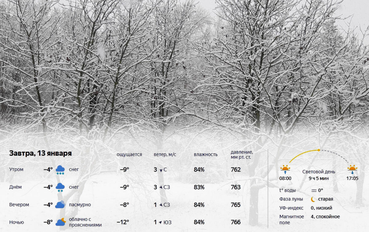 Завтра, 13 января, в Краснодаре ожидается морозная зимняя погода со снегом. Утром около −4°, снег и северный ветер. Днём температура останется на том же уровне, осадки продолжатся. Вечером станет пасмурно и немного тише по ветру, ночью похолодает до −8°. Световой день продлится 9 часов 5 минут, восход в 08:00, закат в 17:05. Температура воды 0°, УФ-индекс низкий, магнитное поле спокойное. Подробнее: https://краснодарскийкрай.рф/news/prognoz-pogody-v-krasnodare-na-13-janvarja-2026-goda.html Прогноз погоды на неделю: https://краснодарскийкрай.рф/pages/weather-forecast.html #погода #прогнозпогоды #температура #осадки #ветер #климат #метеопрогноз #метеосводка #краснодар #краснодарскийкрай #krasnodarregion