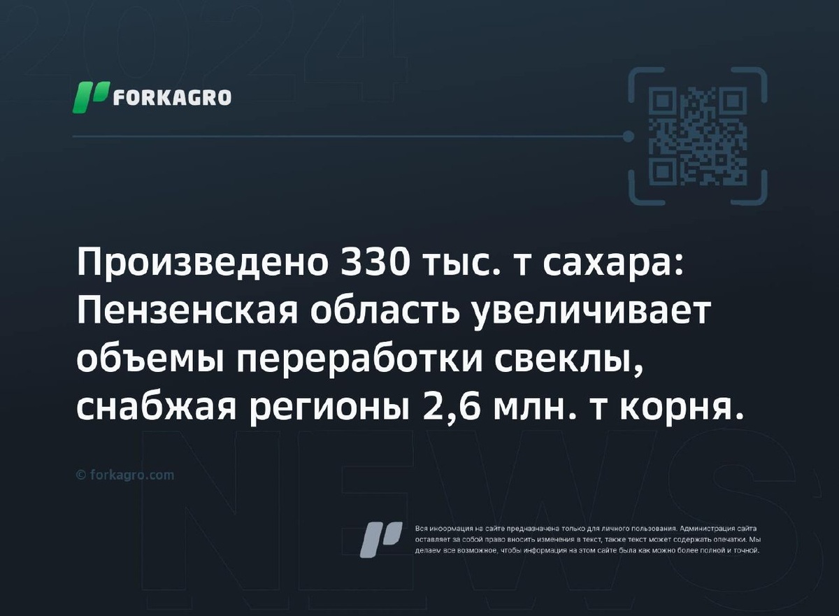 т сахара: Пензенская область увеличивает объемы переработки свеклы, снабжая регионы 2,6 млн. т корня. В Пензенской области активно идёт переработка свеклы на трёх заводах, произведено уже более 2,6 млн тонн корня, что дало 330 тыс. тонн сахара. Планируется переработать 3 млн тонн свеклы и произвести 400 тыс. тонн сахара. Ожидается избыток продукции для местного рынка, излишки отправят в другие регионы. Перейти к источнику