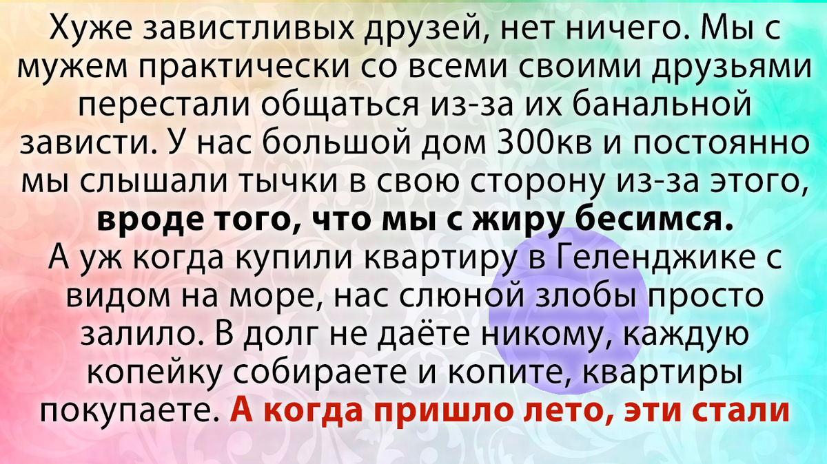 А уж когда купили квартиру в Геленджике с видом на море, нас слюной злобы просто залило. В долг не даёте никому, каждую копейку собираете и копите, квартиры покупаете. А когда пришло лето, эти завистники стали просить ключи от квартиры чтобы отдохнуть бесплатно, но мы отказали. И всё дружба на этом закончилась.