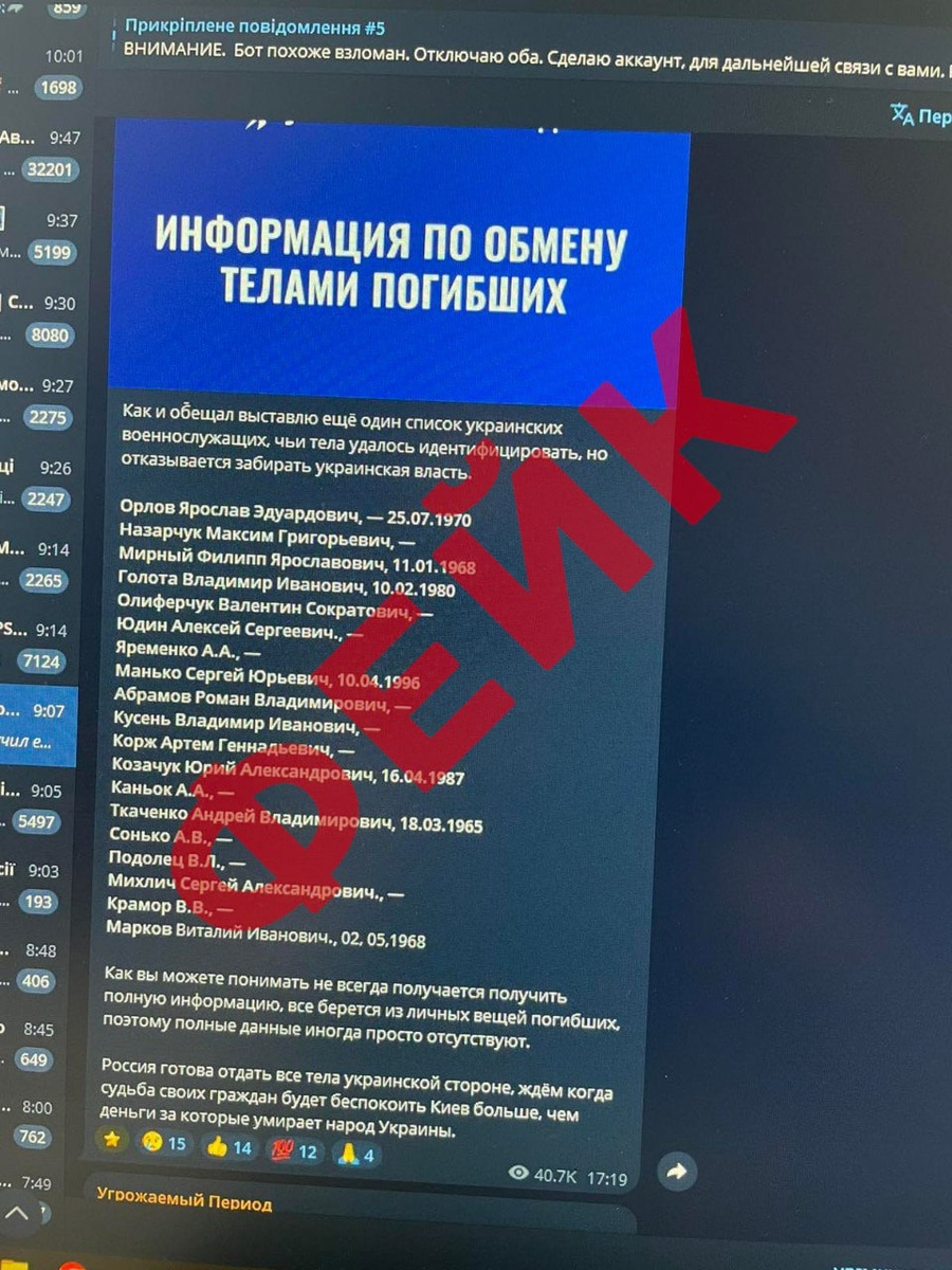 В чат-бот обратились из Украины: родственница военнослужащего ВСУ просила меня помочь его найти . При этом прикрепила скрин якобы списка идентифицированных тел военнослужащих ВСУ, который по её мнению был опубликован на моём канале. ✅ Начал разбираться и оказалось, что подобный список я действительно публиковал 30.06.2024 года, а то, что мне скинули в чат — явная залипуха: многие ФИО изменены кем-то с целью распространения дезы и введения в заблуждение родственников военнослужащих ВСУ. Для наглядности прикрепил два скрина. Будьте бдительны! @iperiodu| @iperiodu_ru x @iperiodu_ua| Подписывайтесь