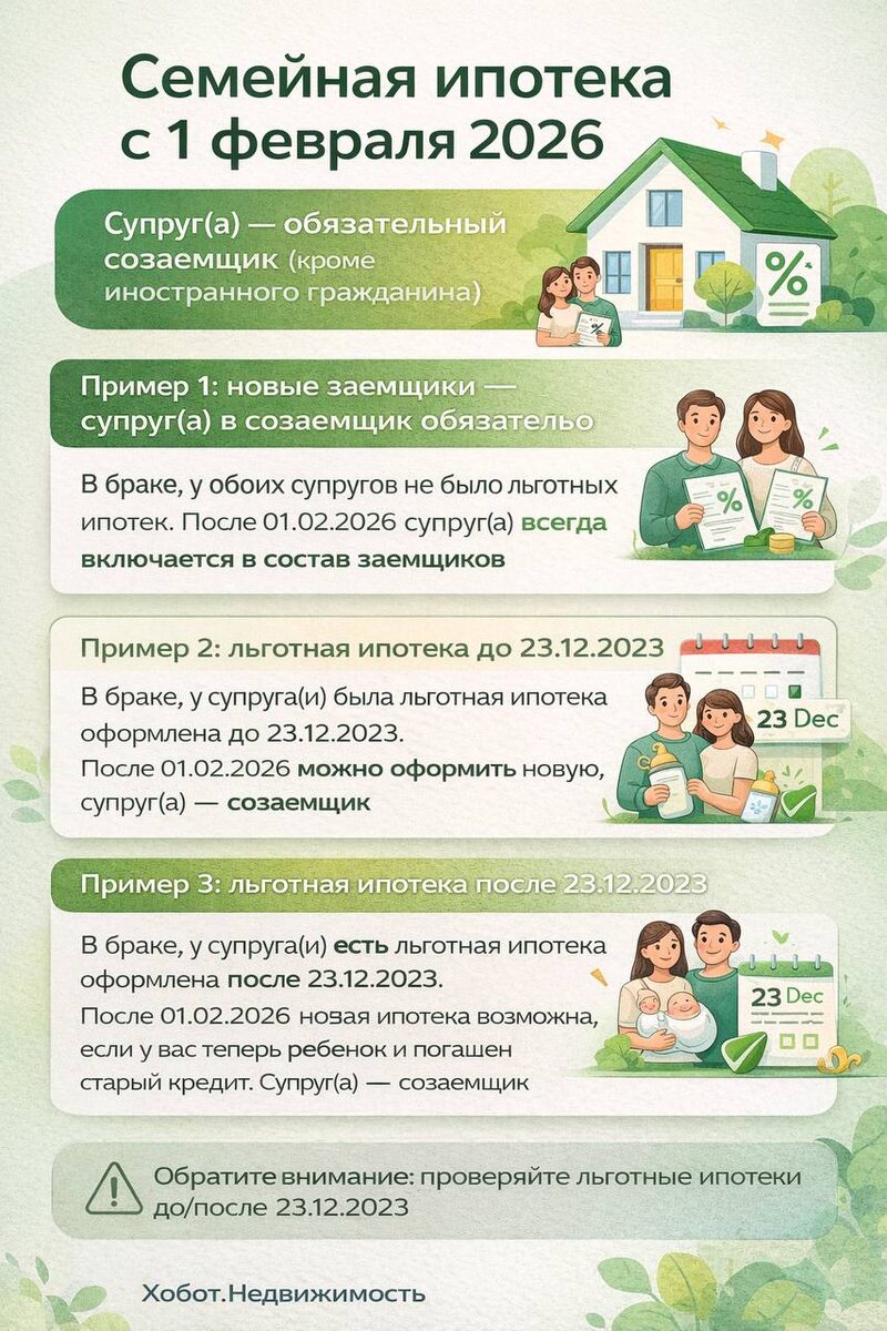 ❗️Главное нововведение: Если покупатель состоит в браке, то включение супруга/супруги в число созаемщиков становится обязательным. Исключение: супруг — иностранный гражданин. 📌То есть теперь «оформлю на себя, а супруга не участвует» — в большинстве случаев не пройдет: супруг(а) будет в составе заемщиков и будет нести солидарную ответственность по кредиту. Что это значит на практике? 1. Стандартная ситуация для новых заемщиков Например: семья в браке, ни муж, ни жена раньше не использовали льготные ипотечные программы. После 01.02.2026г. оформить семейную ипотеку можно только с обязательным добавлением супруга(и) в созаемщики. Оба отвечают по кредиту. 2. У супруга была льготная ипотека, оформленная до 23.12.2023 Например: семья в браке планирует взять семейную ипотеку. У супруга(и) раньше была льготная ипотека (например, ИТ-ипотека), оформленная до 23.12.2023 — до брака или в браке. После 01.02.2026г. семейную ипотеку оформить можно, но супруг(а) обязательно включается в состав за