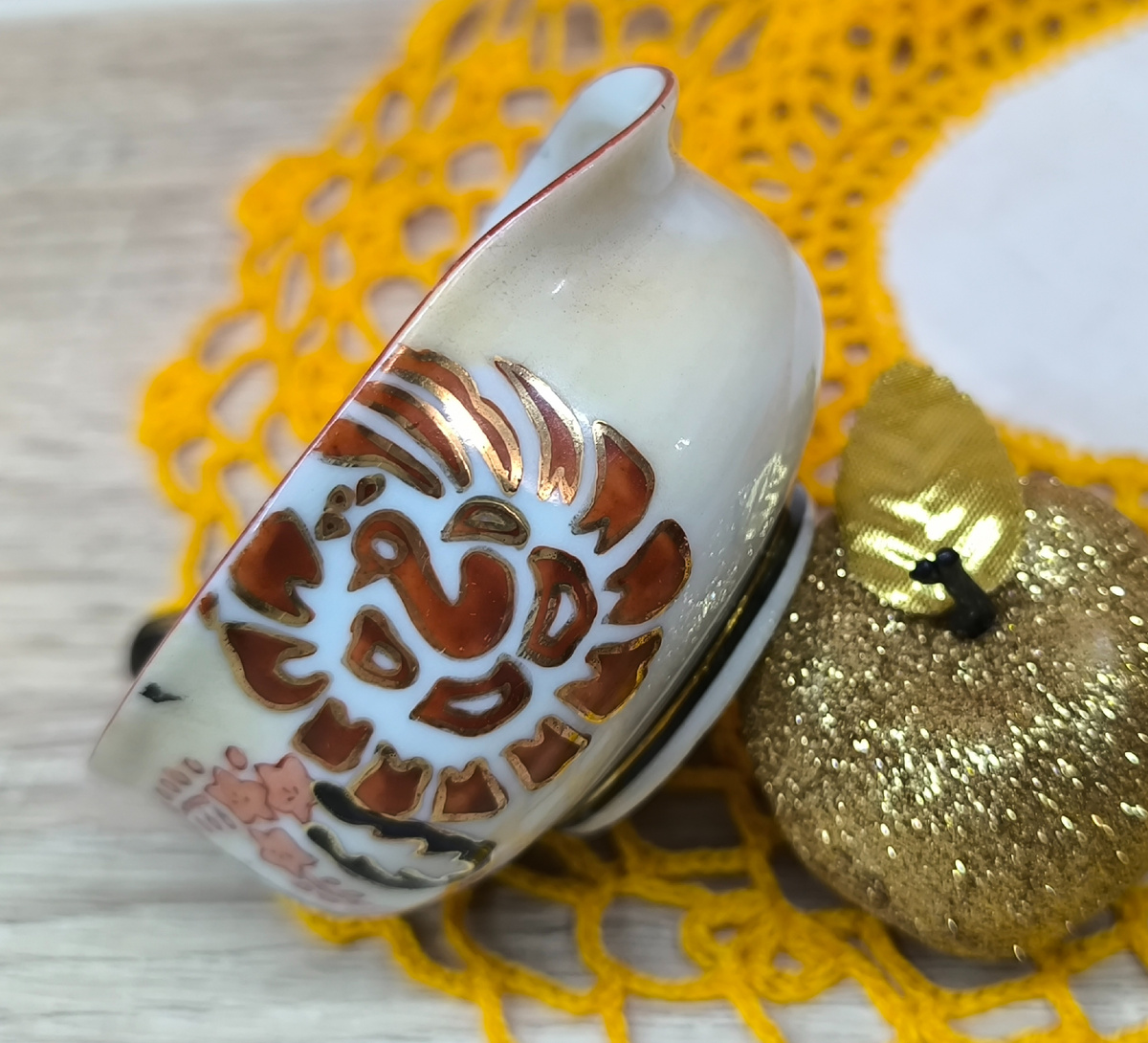 Рада приветствовать, Вас на моем канале. Хочу сегодня поделиться с Вами своим прочти рождественским подарком от моей сестры, в четвертом или пятом поколении, в общем родственницы. Это миниатюрная вещица, пока не знаю как её точно назвать. Изначально, я решила, что это маленький соусник, но возможно нет. Вот смотрите..... Предмет высотой до - 3 см, в диаметре - 8 см. На одном бочке изображение цветов и в одном цветке птичка, все расписано золотыми мазками. На другом незатейливые цветочки с ручной росписью и золотыми мазками. Понизу предмета, идущая синяя и золотая отводка переходящая в изгиб ручки. Внутри белейший фарфор, очень лёгкий. Сверху вид сердечка. Клеймо в двух вариантах, так как не знаю, как будет правильно . В интернете, в одном источнике прочитала, что это чашка - пиала с носиком "Орлиный клюв" для заваривания чая. В другом источнике, что чашка для саке, вот фото. Мне понравилась эта вещица своей чистотой фарфора, элегантностью и качеством. Данная посудинка, переш