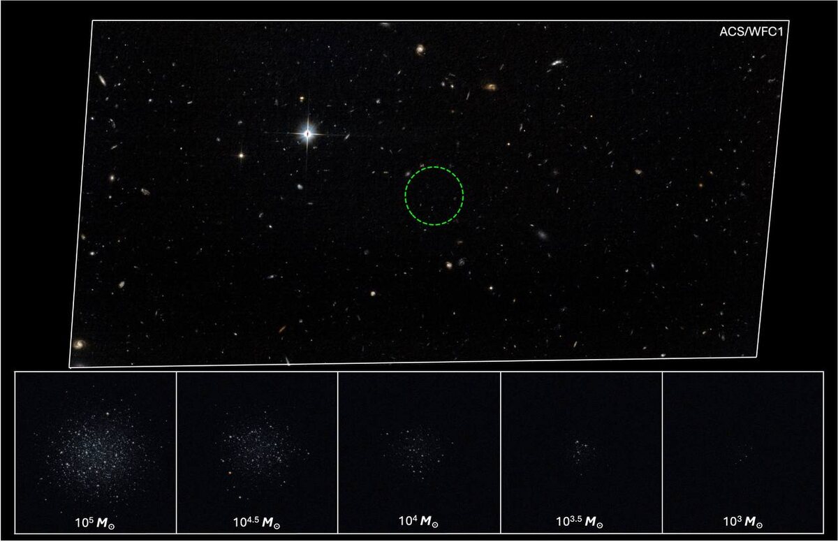 Сверху: цветная композиция изображений ACS/WFC1 (∼202″ × 100″). Внизу: смоделированные карликовые галактики с разным диапазоном звёздных масс, созданные в тех же условиях наблюдения и показанные в том же физическом масштабе, что и данные ACS.