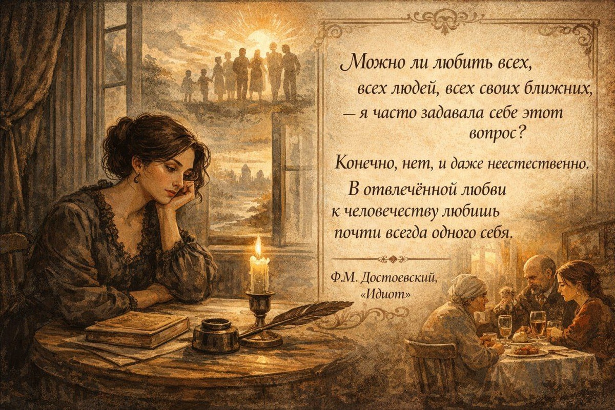 И часто бывает так, что вы скучали по семье, представляли себе душевные посиделки, а на деле всё вышло немного иначе. Шум, двадцать вопросов о личной жизни и работе, спор из-за салата «Оливье» и тётя Люда, которая два часа рассказывает о своих болячках. И где-то глубоко внутри шевелится мысль: «Я же всех люблю, отчего мне так тяжело?» Моим мыслям на этот счет будто вторят строки из «Идиота» Достоевского: Можно ли любить всех, всех людей, всех своих ближних, — я часто задавала себе этот вопрос? Конечно, нет, и даже неестественно. В отвлеченной любви к человечеству любишь почти всегда одного себя. Любить всё человечество — легко. Это абстрактное тёплое чувство к некоему образу семьи, картинке из детства. А вот любить конкретных людей — это, похоже, настоящая работа. Приходится терпеть привычки дяди Васи и не огрызаться на советы бабушки. Праздники — это время, когда наша отвлечённая любовь сталкивается с реальностью. И если нам порой трудно в этой реальности, это не значит, что мы плох