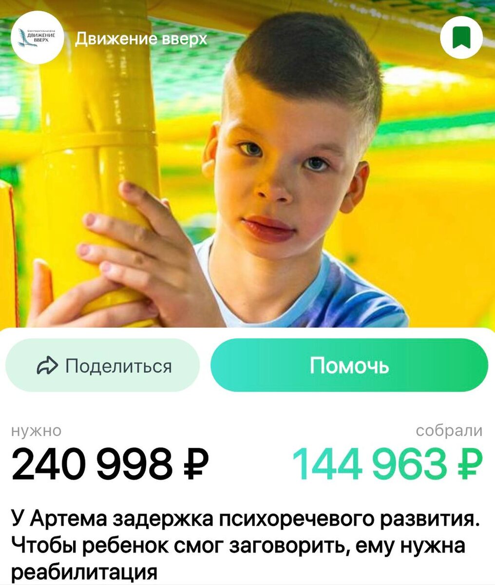 Ваша помощь очень нужна подопечным детям нашего фонда «Движение вверх» - Артему Сасину, Коле Войтюку и Косте Ткаченко. Сбор средств осуществляется в приложении Tooba. Артем Сасин родился в срок, путем кесарева сечения. Казалось, самое страшное позади. Но у малыша не заживал пупок, потребовалась операция. А потом – долгие месяцы тревоги: наркоз дал осложнения, Артем начал отставать в развитии. Ходить научился только в год и пять месяцев. Сейчас ему 10 лет, он бегает, играет, физически развит, но не говорит, есть только звуки и лепет. Врачи ставят мальчику диагноз – грубая ЗПРР (задержка психоречевого развития), аутистические черты личности. Каждый курс реабилитации – это крошечный прорыв. После упорных занятий Артем начал произносить первые слова: «мяу», «дай», «иди», «мама». Очередной курс реабилитации родители не могут оплатить самостоятельно. Каждое ваше пожертвование – это шаг к тому, чтобы Артем смог заговорить! Коля Войтюк родился раньше положенного срока, из-за гипоксии и асфикс