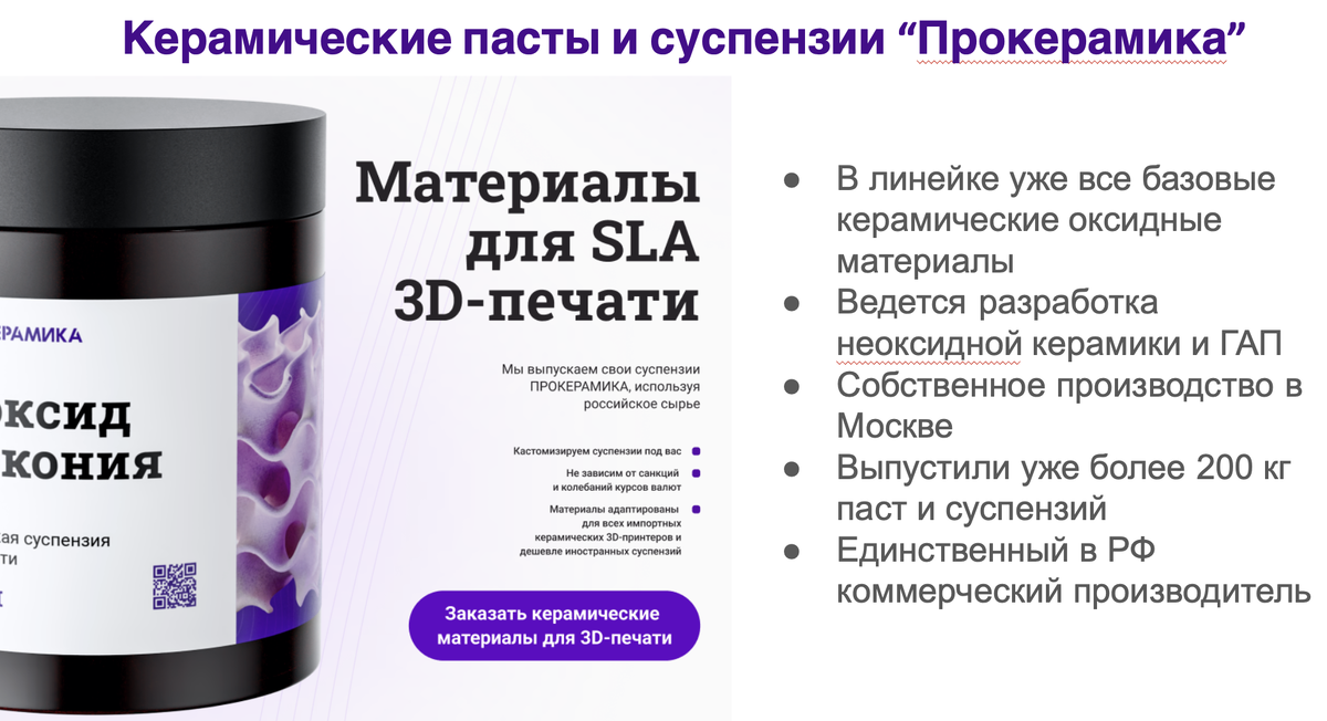 Пасты Прокерамика разрабатываются как замена расходников 3DCERAM (3DMIX) и Lithoz для печати на иностранных установках, а затем были адаптированы и под нашу установку Прокерамика-170. Наш коллектив имеет более 5 лет опыта керамической 3Д-печати в России. Наши суспензии выпускаются на российском сырье, могут кастомизироваться под задачу, а также существенно дешевле немногочисленных иностранных аналогов.