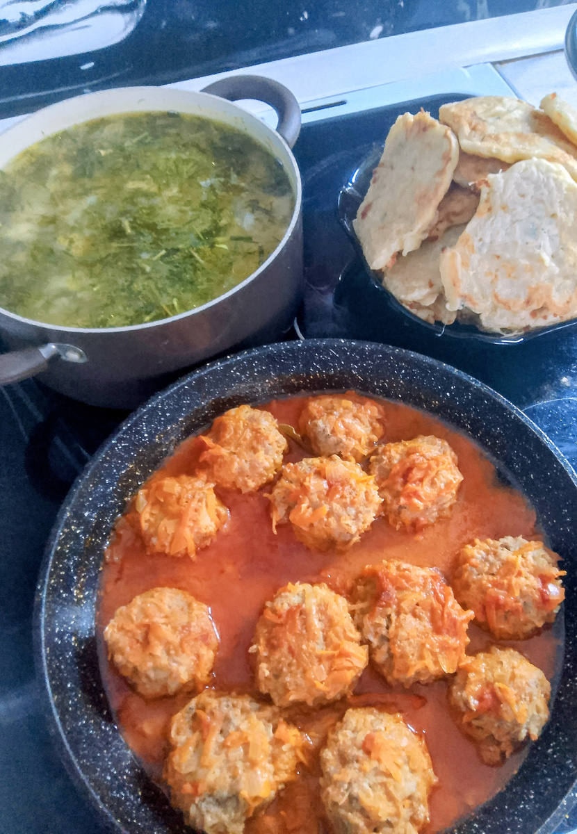 В первой половине дня взялась за готовку на обед обычный куриный суп, к ужину мясные тефтели (без риса) в томатном соусе с обжаркой, на гарнир спагетти ещё достаточно, и сделала сырные лепешки с сулугуни.