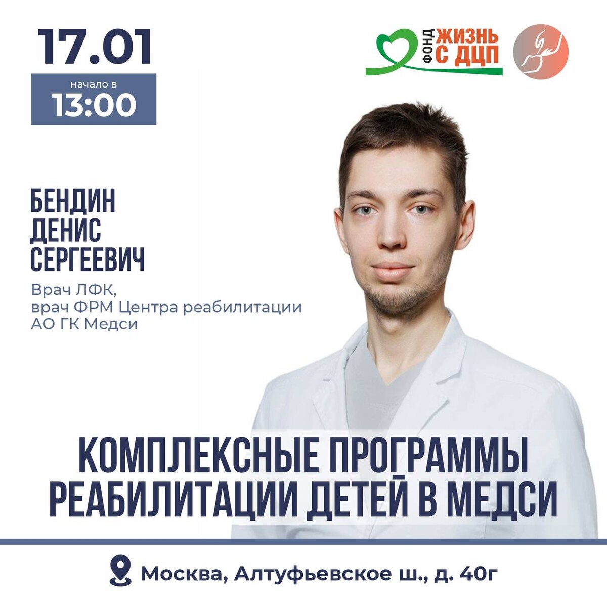 ! 🗓17 января 2026 года в 13.00 в помещении БФ "Жизнь с ДЦП" по адресу Алтуфьевское шоссе, 40Г, состоится встреча с врачом ЛФК, врачом ФРМ Центра реабилитации АО ГК Медси, Бендиным Денисом Сергеевичем. 📄Доктор выступит с докладом "Комплексные программы реабилитации детей в МЕДСИ". На встрече вы узнаете: ✅какие показания для прохождения кура реабилитации в АО ГК Медси; ✅какие процедуры и занятия входят в курс реабилитации; ✅какие методики применяются; ✅какие условия проживания в клинике; ✅какие условия прохождения реабилитации в дневном стационаре; ✅какие варианты оплаты реабилитации существуют; ✅как записаться на курс. Количество мест ограничено. 💻Для участия в мероприятии необходима регистрация. Записаться и задать вопросы можно, перейдя по ссылке