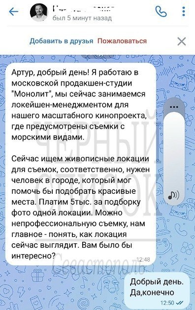 Горожанам предлагают заработок за съёмку «красивых мест». Отправители представляются московской студией, но такой компании давно не существует. Авторы сообщений путаются в объяснениях и не могут подтвердить, кто они на самом деле. Власти советуют относиться к таким предложениям с осторожностью. 💿Мы в MAX — подпишись! 🔴Подписаться на Севастополь в курсе
